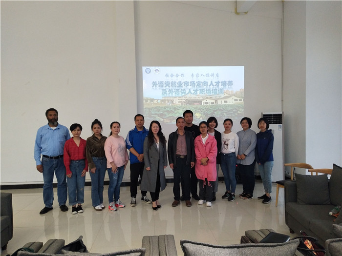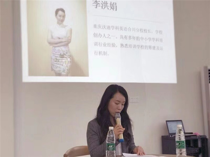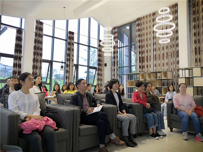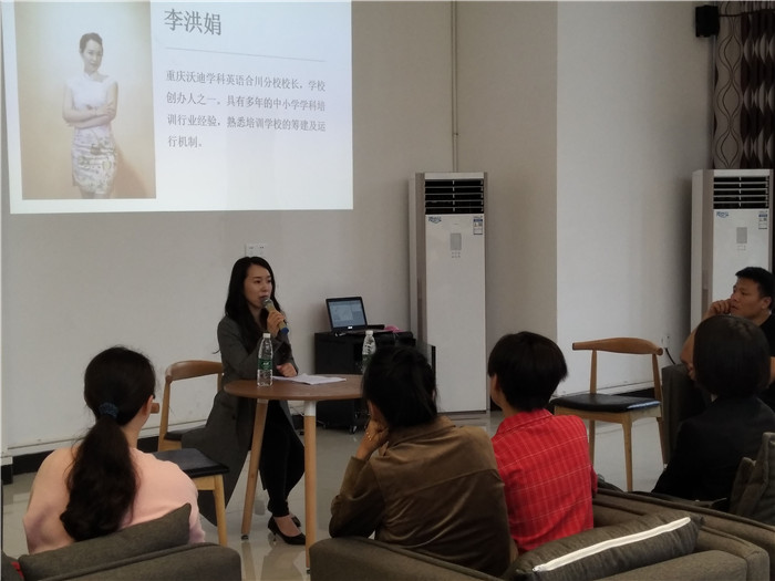 5月28日下午,外语系邀请到我校校企合作企业重庆沃迪教育科技有限公司合川分校的校长及创办人之一李洪娟做客天渠110活动室,向外语系在校师生开展“外语类就业市场定向人才培养及外语类人才职场培训”讲座。一同参与讲座话题分享的还有目前任职于沃迪英语合川分校的外语系优秀毕业生。外语系主任吴世银,副系主任罗琳、祝玮,大学英语教研室主任张旭宁,德语教研室主任熊光源,教学团队负责人李静,毕业生辅导员纪治阳及各年级学生代表出席讲座。