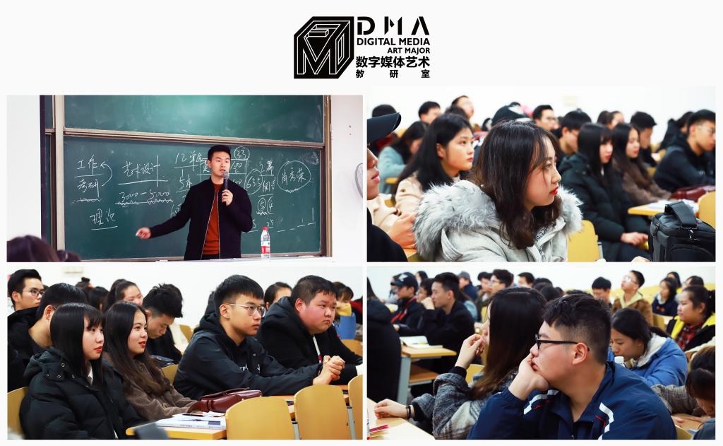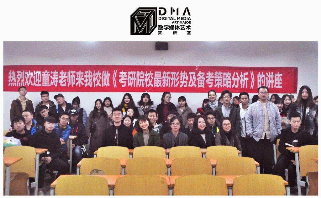 为了响应学校信息产业商学院的定位,践行完满教育方针,创造浓厚的考研氛围,激发同学们的考研激情,提高同学们的考研能力,推动数字媒体艺术专业人才培养模式和实践教学改革,提高人才培养质量。2018年12月5日16:00在4101教室开展了本学期艺术传媒学院数字媒体艺术专业的第二期考研推进会,本次活动由数字媒体艺术教研室牵头,艺术传媒学院团总支共同承办,邀请到童涛老师为我们开展主题为“考研院校最新形势及备考策略”的分析会。童涛老师曾经获得2012年全国手绘大赛一等奖、2013年全国“新鲁班”奖获得者、2014年湖北省美术大赛二等奖、2016年武汉世界园艺博览会优秀城市展园奖、2017年作品参展于深圳创意周活动,并获奥雅国际之星称号等奖项,同时还出版了多部艺术类书籍、出版多本教学教材等。童老师向同学们就考研专业的具体方向、工作前景等做了详细介绍,分析了历年来的考研形势及报考研究生院校的方法与技巧,并对专业与院校选择给出了可行性的建议,紧接着对考试题型及应对策略做出了相应的解析。