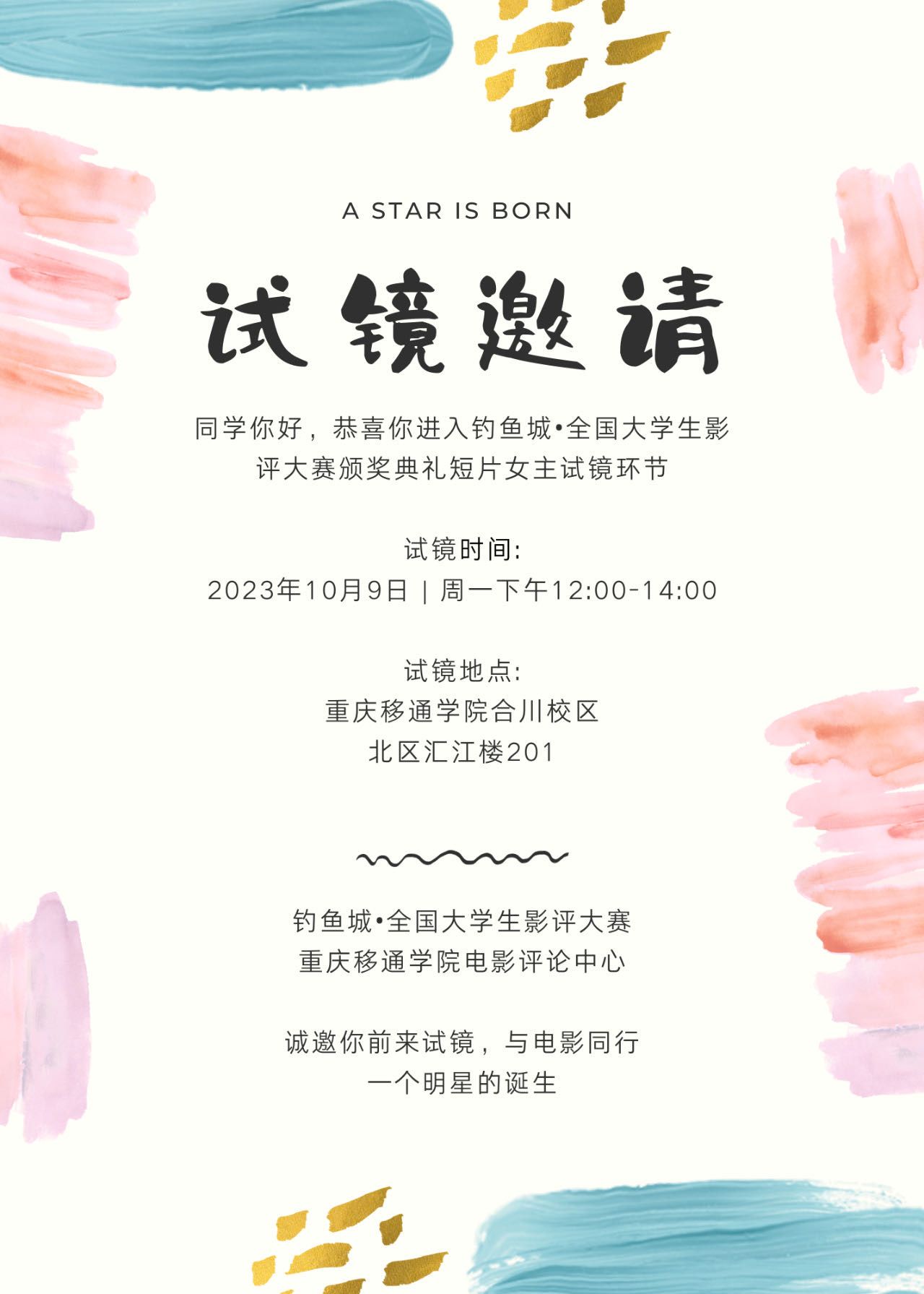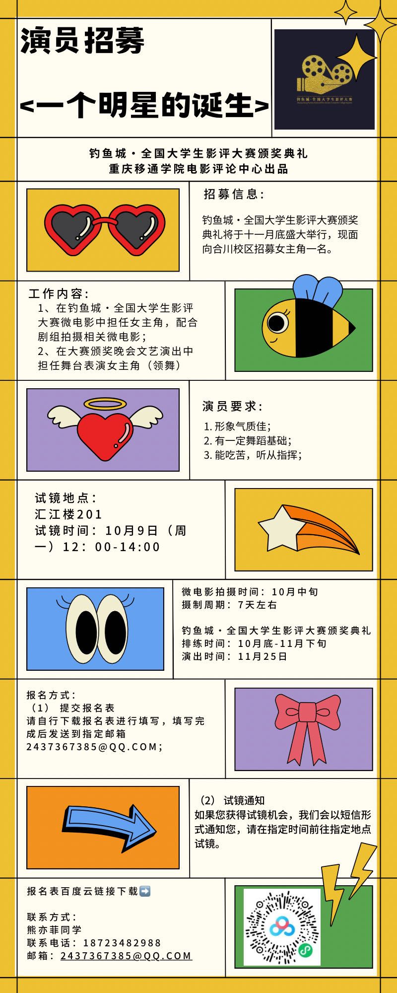 跳上舞台,闪耀演艺梦!钓鱼城·全国大学生影评大赛颁奖典礼将于十一月底盛大举行,现面向全校同学招募女主角一名。