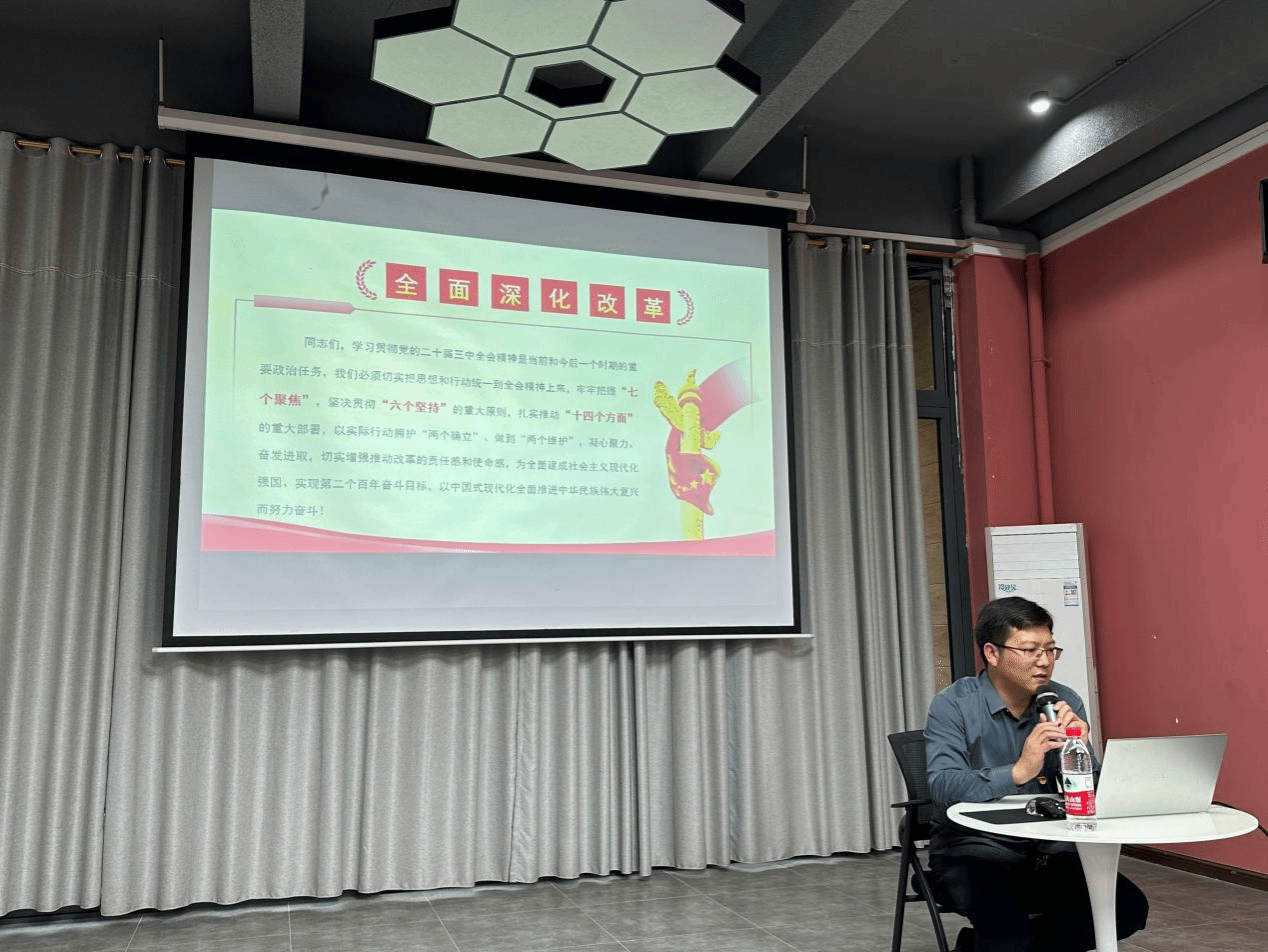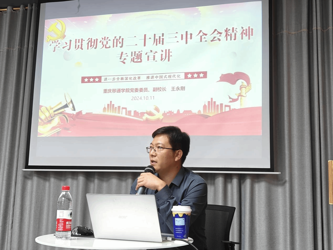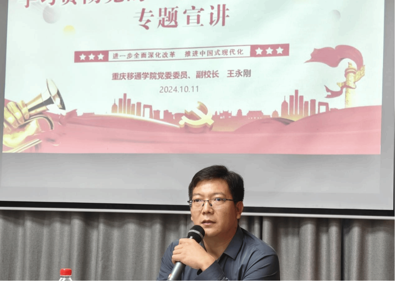 重庆移通学院党委委员、副校长王永刚同志做主题宣讲。党的二十届三中全会是在以中国式现代化全面推进强国建设、民族复兴伟业的关键时期召开的一次十分重要的会议。王永刚副校长首先强调了这一会议的重大意义,让党员同志们深刻认识到此次全会对于国家发展的关键引领作用。他指出,在当前的历史节点上,全会的召开为国家的前进道路指明了方向,对于凝聚全党全国各族人民的力量、推动国家的持续发展具有不可替代的重要性。在深入学习领会习近平总书记在党的二十届三中全会上的重要讲话精神方面,王永刚副校长进行了细致的解读。他带领党员同志们认真学习总书记讲话中的核心要点和精神内涵,使大家更加明确了党在新的历史时期的领导核心作用以及对全体党员的要求和期望。通过对讲话精神的学习,党员同志们进一步坚定了自己的政治信仰,增强了对党的忠诚和拥护。
