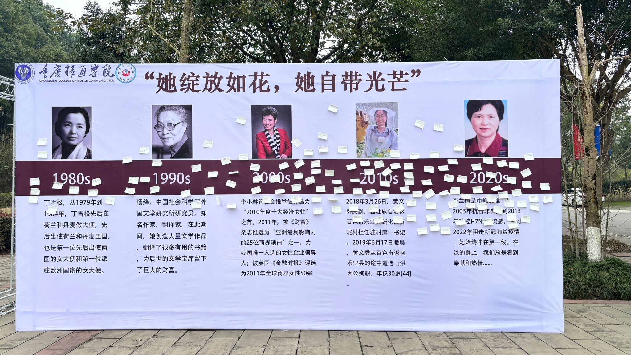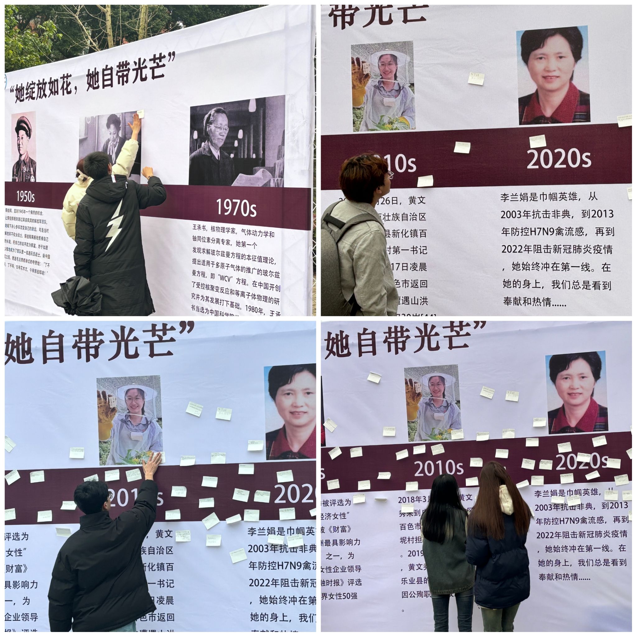活动现场同学们有序的参观阅读喷绘上的女性故事,同时将对广大女性同胞最美好的祝愿或是对敬佩的女英雄说的话写下并粘贴上展示墙,通过了解女性故事、彰显女性风采,展示女性魅力,激发女性力量。