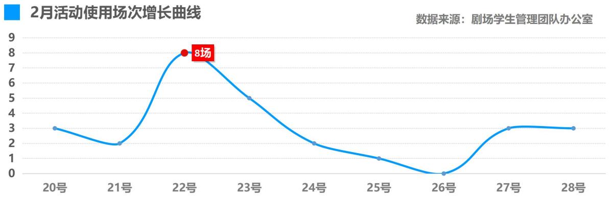 据统计,缤果大剧院、下里巴人剧场(以下简称“剧院剧场”)和六度空间·大学生发展中心(以下简称“六度空间”)3个板块8个剧场使用共计 27 次,使用时长 111.5 小时。其中,剧院剧场 7 次,使用时长 30 小时;六度空间 20 次,其中用于授课及内部所属单位固定使用 8 次,对各单位开放使用 12 次,使用时长 81.5 小时。除去节假日,平均每天使用近4次,每天使用近 16 小时。