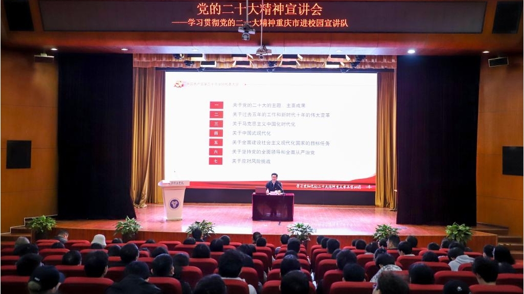 为了学习好、宣传好、贯彻好、落实好党的二十大精神,2月27日,党的二十大精神重庆市进校园宣讲队成员、重庆市教委二级巡视员刘先海同志走进我校为师生作学习贯彻党的二十大精神进校园宣讲报告。在校校领导、各基层党组织负责人、各部门和二级学院负责人以及师生代表等共计380余人参加了会议。报告会引起学校广大师生热烈反响,带动我校师生进一步深入学习党的二十大精神。