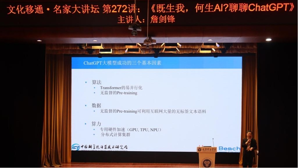2月23日,重庆移通学院邀请到了中科院计算所研究员,先进计算机研究中心主任詹剑锋教授在下里巴人剧场为同学们开展了主题为《既生我,何生AI?聊聊ChatGPT》的讲座,向同学们展示了当下热点ChatGPT的发展历程以及其计算的优势与存在的问题。