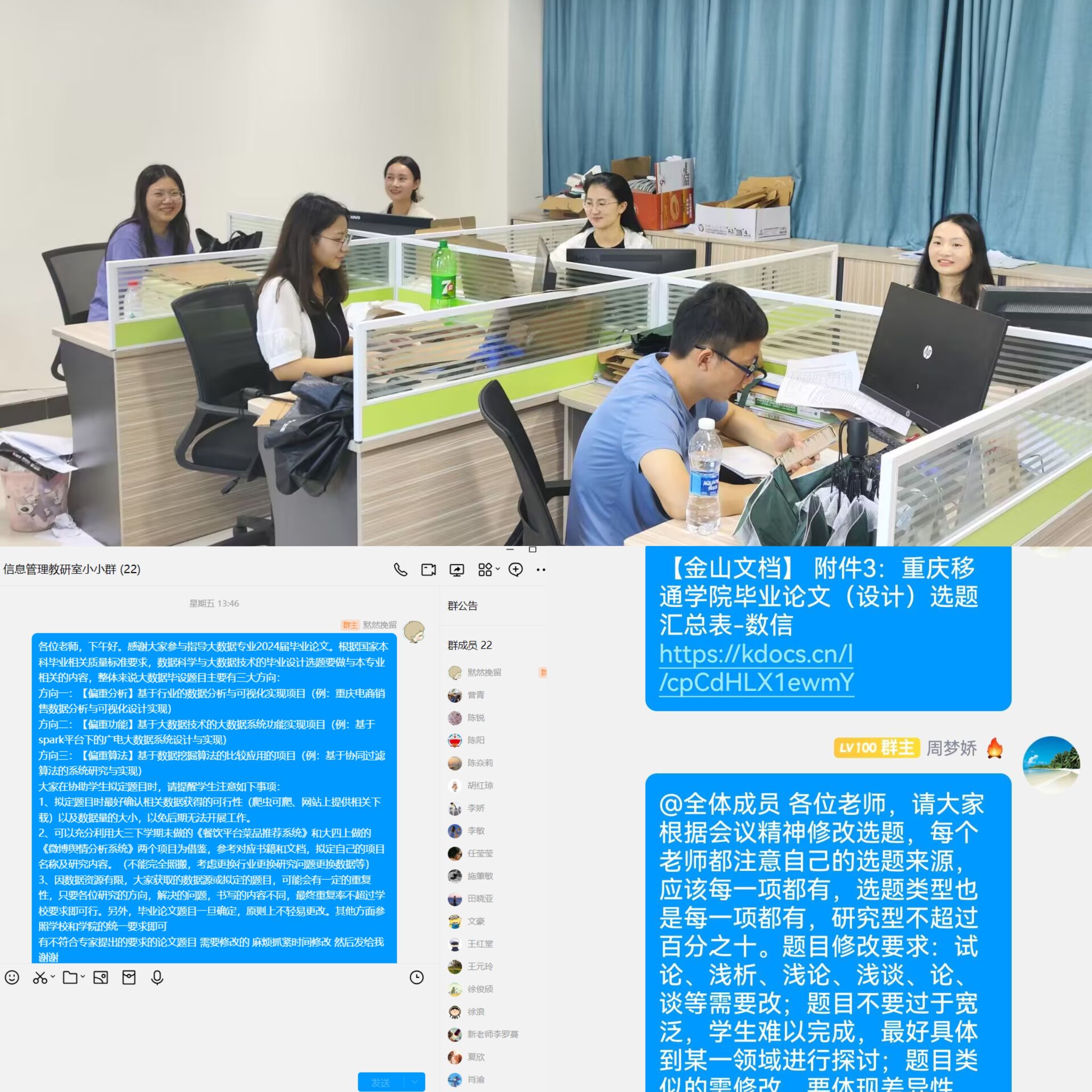 2023年9月,学院根据学校毕业论文(设计)的通知要求,工程管理教研室、信息管理教研室、学院层面先后开展了4场培训会,有序组织选题安排、选题培训、指导老师等工作。各次的培训重点着重于文件学习、并按通知梳理指导教师指导资格、各个专业选题数量及其任务安排、选题方向与选题质量标准解读、往年选题的经验与总结、选题注意事项、选题重复率等重要事宜,为稳步推进论文选题工作提出方向性指导。