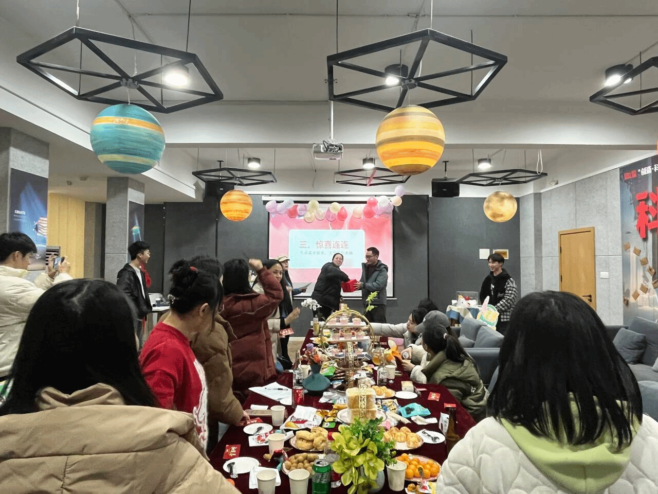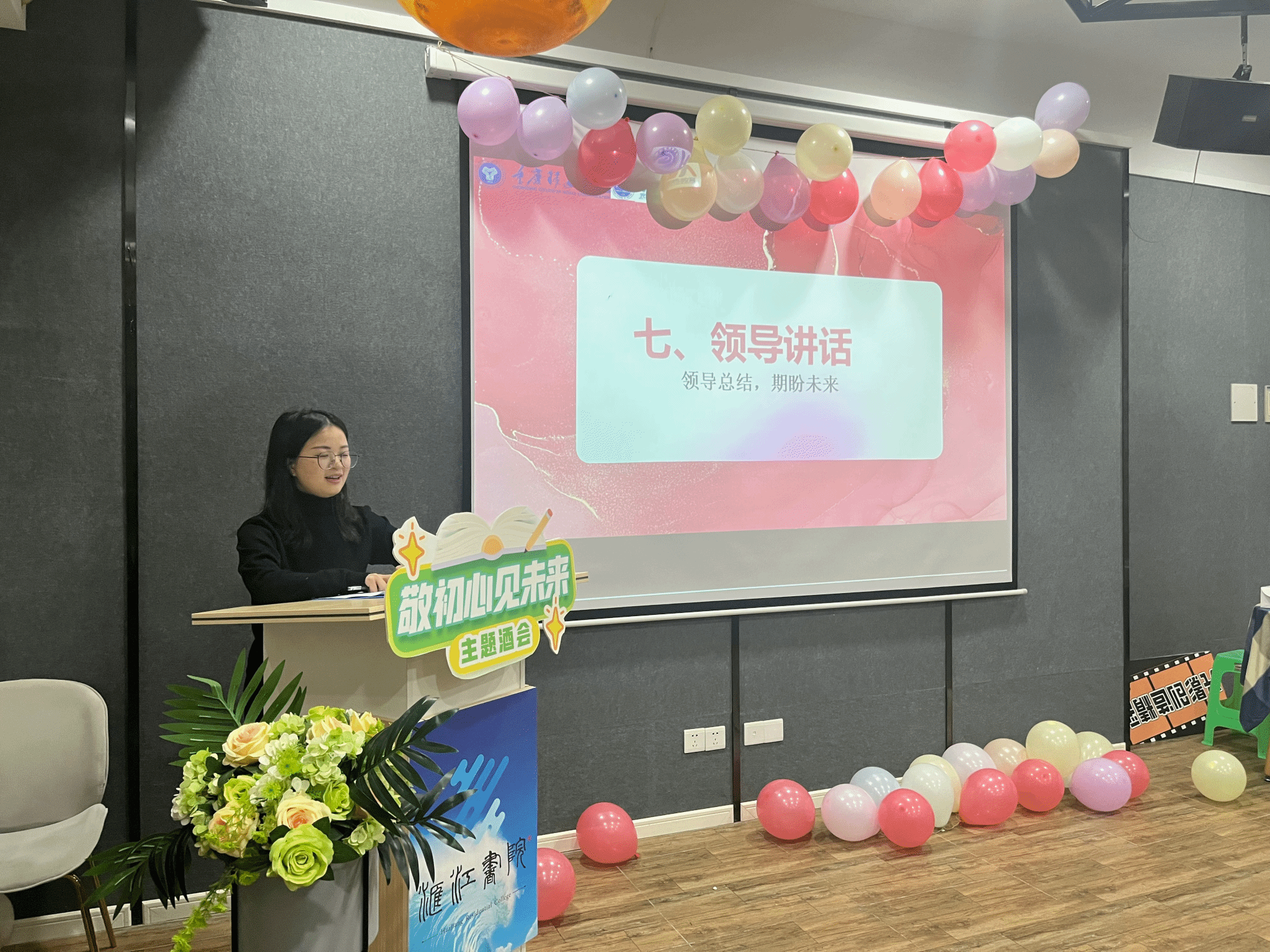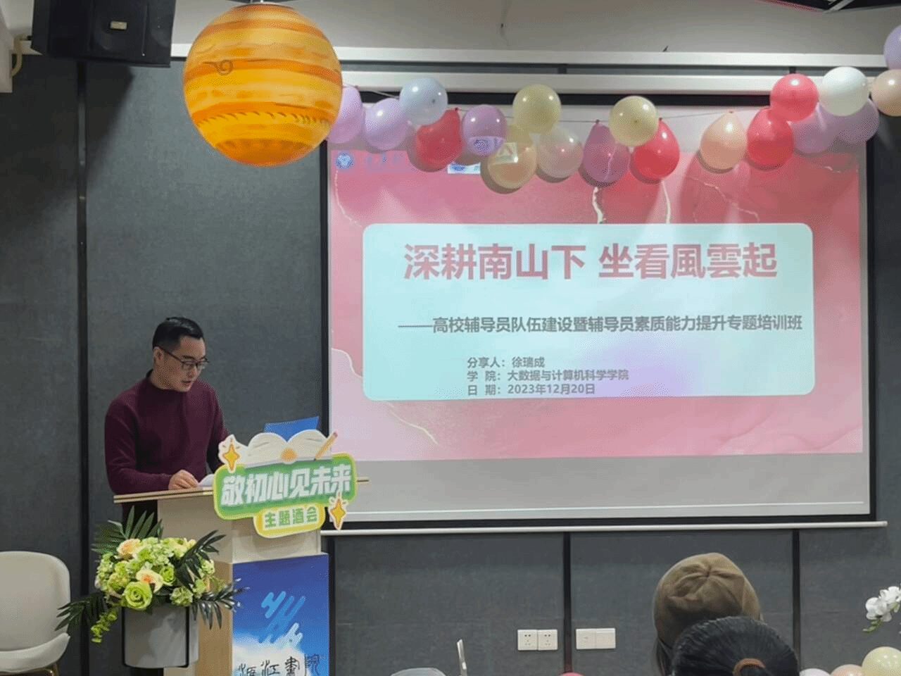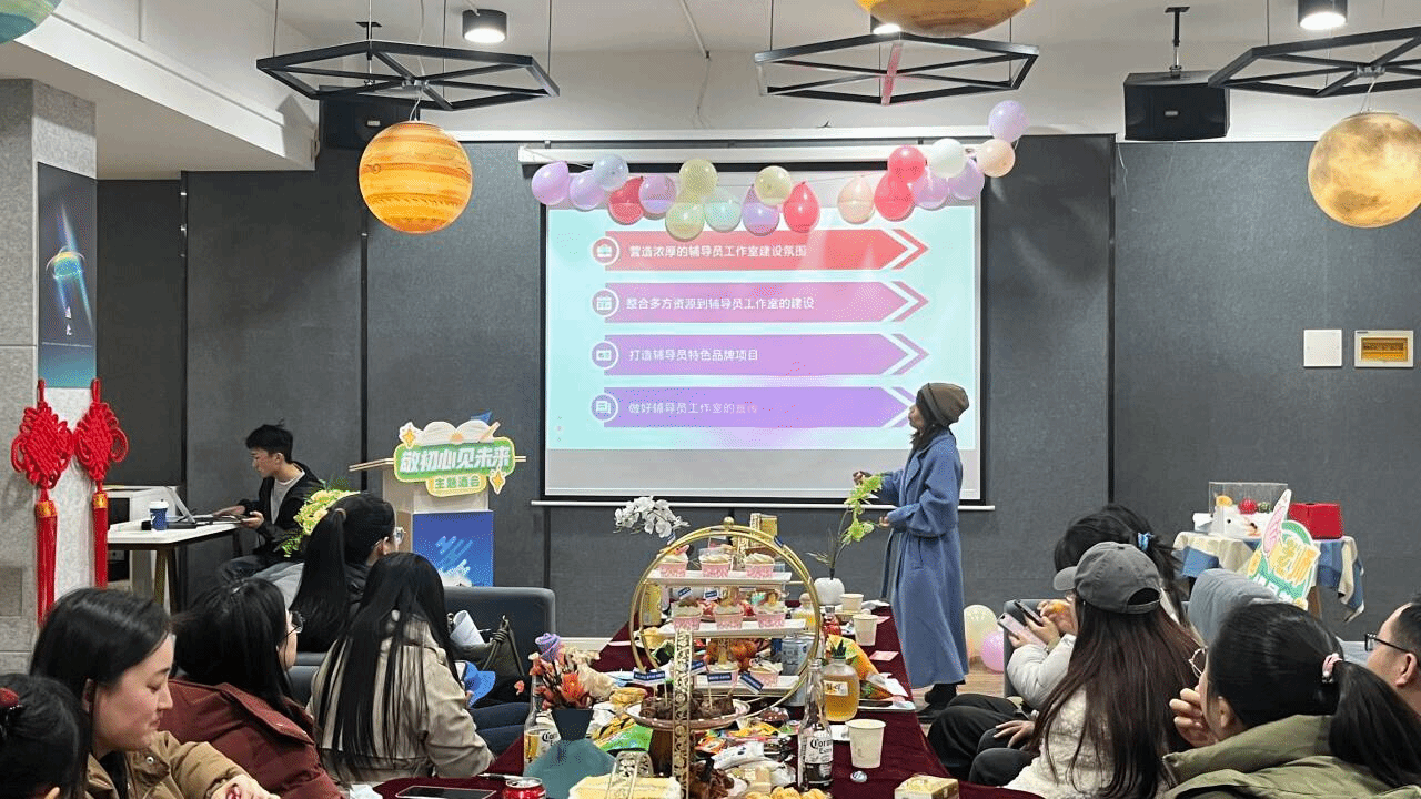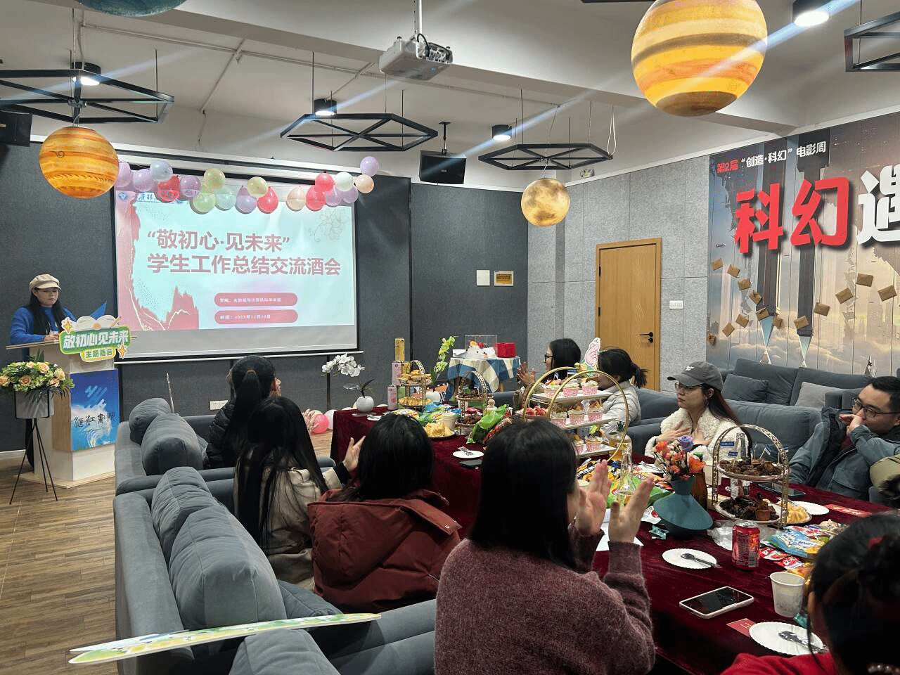 为进一步加强辅导员队伍建设,优化学生工作思路,提升学生教育管理工作水平。大数据与计算机科学学院旨在提高学工团队的团队凝聚力及协作合作意识,充分发挥在学校完满教育工作中的重要作用,激励辅导员在繁重的工作之余依然保持热情、激情和创造力。大数据与计算机科学学院于12月20日15:00在汇江书院影音活动室开展“敬初心 ·创未来”学生工作总结交流酒会,学工副院长阙小梅老师、就业创业办主任周义巧老师、校团委指导老师杨婕老师、学工办和团总支负责人彭崇清以及全体辅导员参加2023-2024学年第一学期学生工作总结交流酒会。