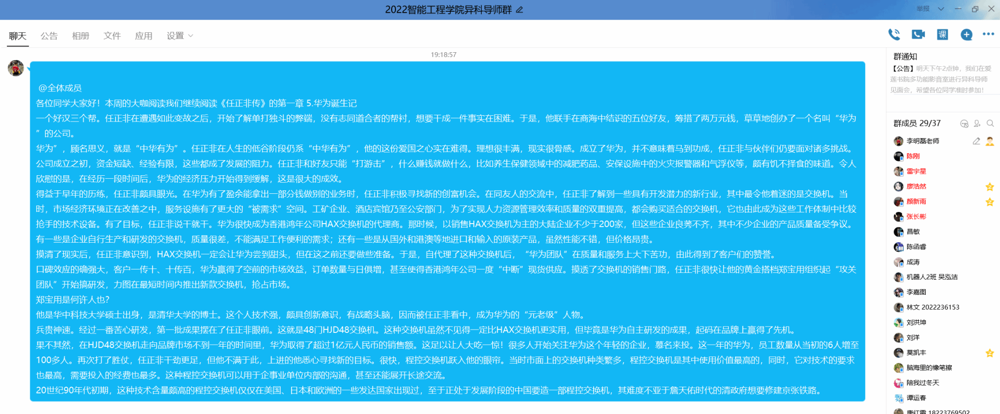李明磊老师通过线上开展“职业规划及简历制作”的讨论学习,指导学生制订自己的职业规划和简历,针对学生未来的就业方向提出一些建议。同时积极组织同学们坚持“大咖阅读”《任正非传》,要求同学们开展每天一分钟演讲练习,锻炼学生的语言表达能力,为即将迎来的工作面试做好准备。