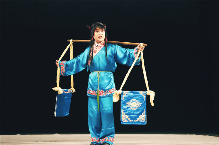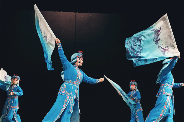 是出典型的武旦戏。武且,旦行的一种。大多扮演勇武的女性,如武将和江湖人物中的各类女侠,表演上注重武打和绝技的运用。《泗州城》讲述了泗州城水母幻化人形,欲与书生乌延玉成婚。乌延玉骗取水母身上的明珠,逃出洞房。水母大怒,率领水族兴动波涛,淹了泗州城。观音菩萨遣众神将与之搏斗,终将水母擒获的故事。