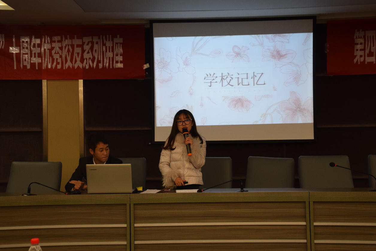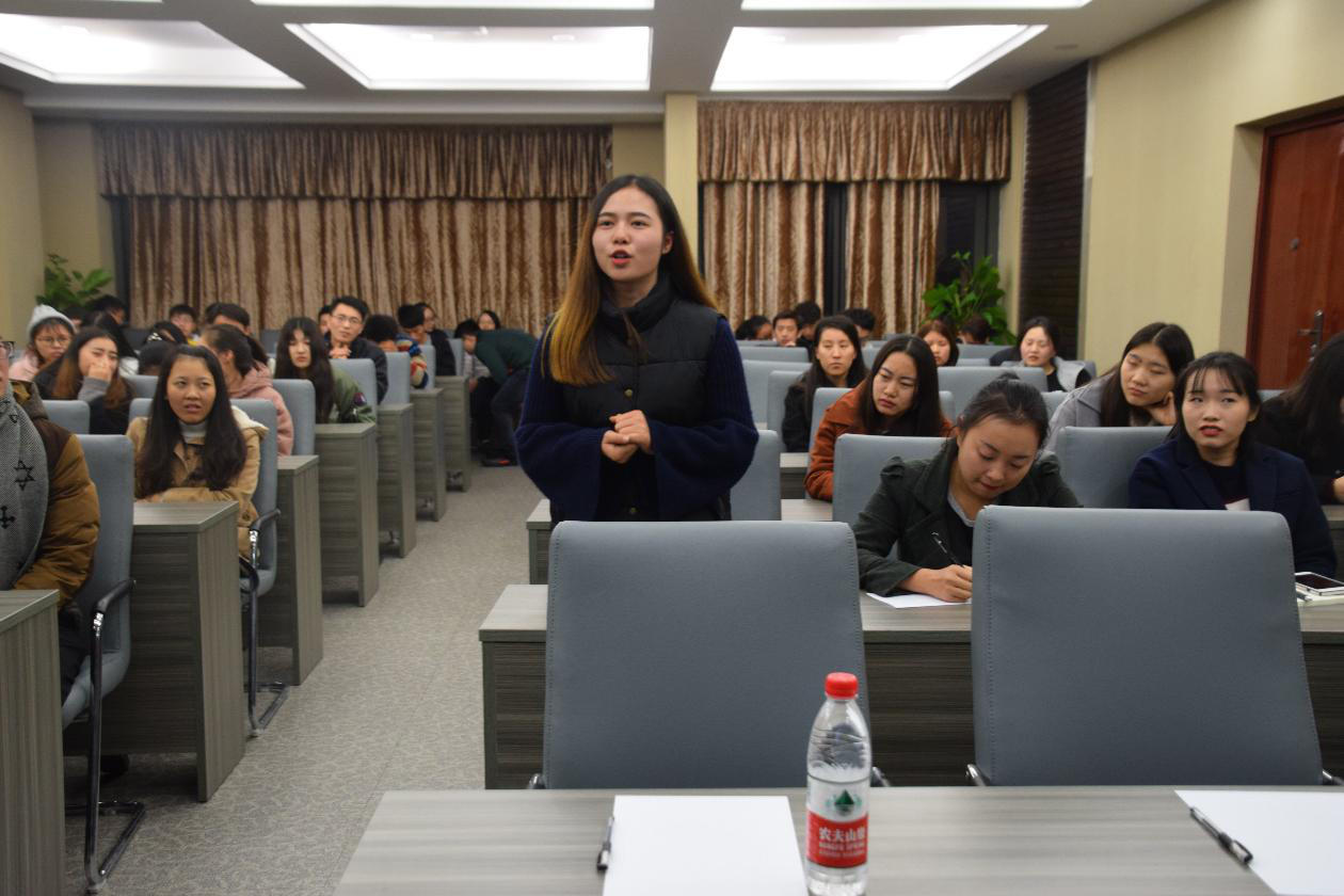 紧接着杨清校友分享了她在大学毕业后的规划和工作经验。她参加选调生考试,并演唱了“重庆选调生之歌”为她的选调生考试交上了一份完美的答卷。而后杨清校友分享了她在工作中的例子:在做扶贫工作时她扶贫了一户人家,在扶贫中感受到他们“艰苦奋斗,自力更生”的精神。扶贫的例子再一次鼓励同学们要刻苦完成自己的学业、为梦想而奋斗。最后杨清校友以问答的方式为同学们分析银行公招、特定岗位、事业单位等相关问题。