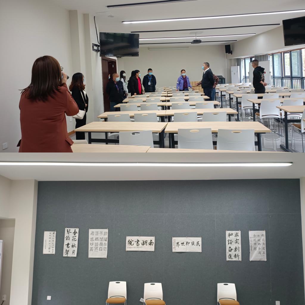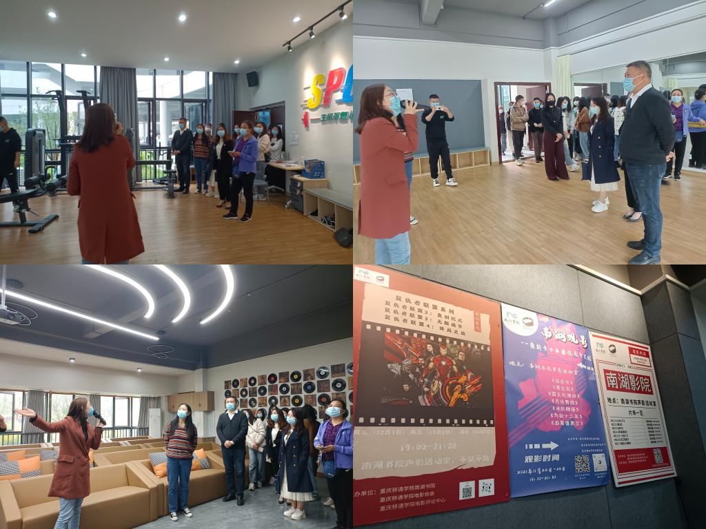 在齐旭老师的带领下,陆续参观了健身房、排练厅和声影活动室。健身房有很多“高大上”的健身设备,老师和学生无需预约,可直接去锻炼身体,得到现场很多老师的青睐;排练厅经预约后可以排练舞蹈、小品等活动;声影活动室需要预约使用,是南湖书院容纳量最大的活动室,可以开展讲座、大型沟通会、音乐会等,每周还会放映一些经典影片。