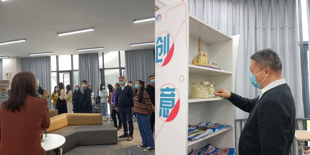最后,齐旭老师带领来到智慧教室和圆桌会议室进行参观。智慧教室功能多变,既可以作为老师录播课堂,也适合老师开展“翻转式”课堂教学,也可以用作师生学习、研讨开会等场所。圆桌会议室秉承联合国圆桌会议的概念,平等交流、互助发展是本功能室的主旨,也彰显着我校的国际化办学文化与国际发展主张。