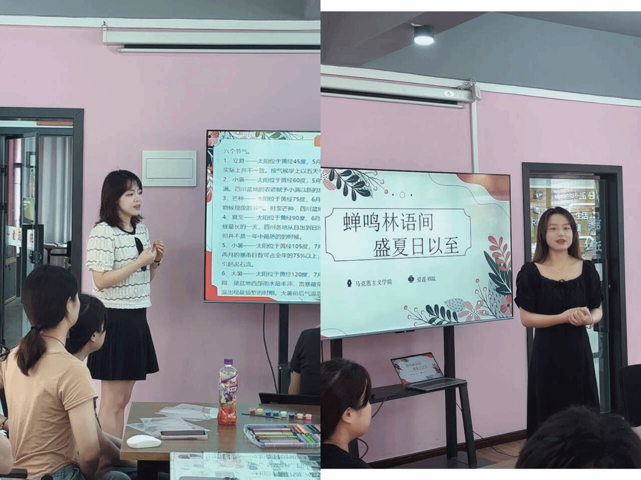 “北京时间6月21日22时58分将迎来‘夏至’节气,这意味着一年中最热的阶段即将到来,夏至是二十四节气中,最早被确定的一个节气,此时白昼之长、日影之短,都达到了北半球一年中的极限,整个夏天的生机和美好在此刻尽情释放。”随着徐梦笛老师的讲解,本次活动拉开了帷幕,同学们在老师的带领下不仅了解到夏至这一节气的文化渊源,也明白了传统节气习俗和文化对中华传统文化的深远意义。“公元前7世纪,先人用土圭测日影,据《恪遵宪度》:日北至,日长之至,日影短至,故曰夏至。至者,极也。夏至这一天,白天之长,日影之短,都达到了一年中的极限,所以叫做‘夏至’。”在老师的介绍与讲解中,同学们对于这即将到来的节气也不再陌生,纷纷回忆起自己家乡的节气习俗。