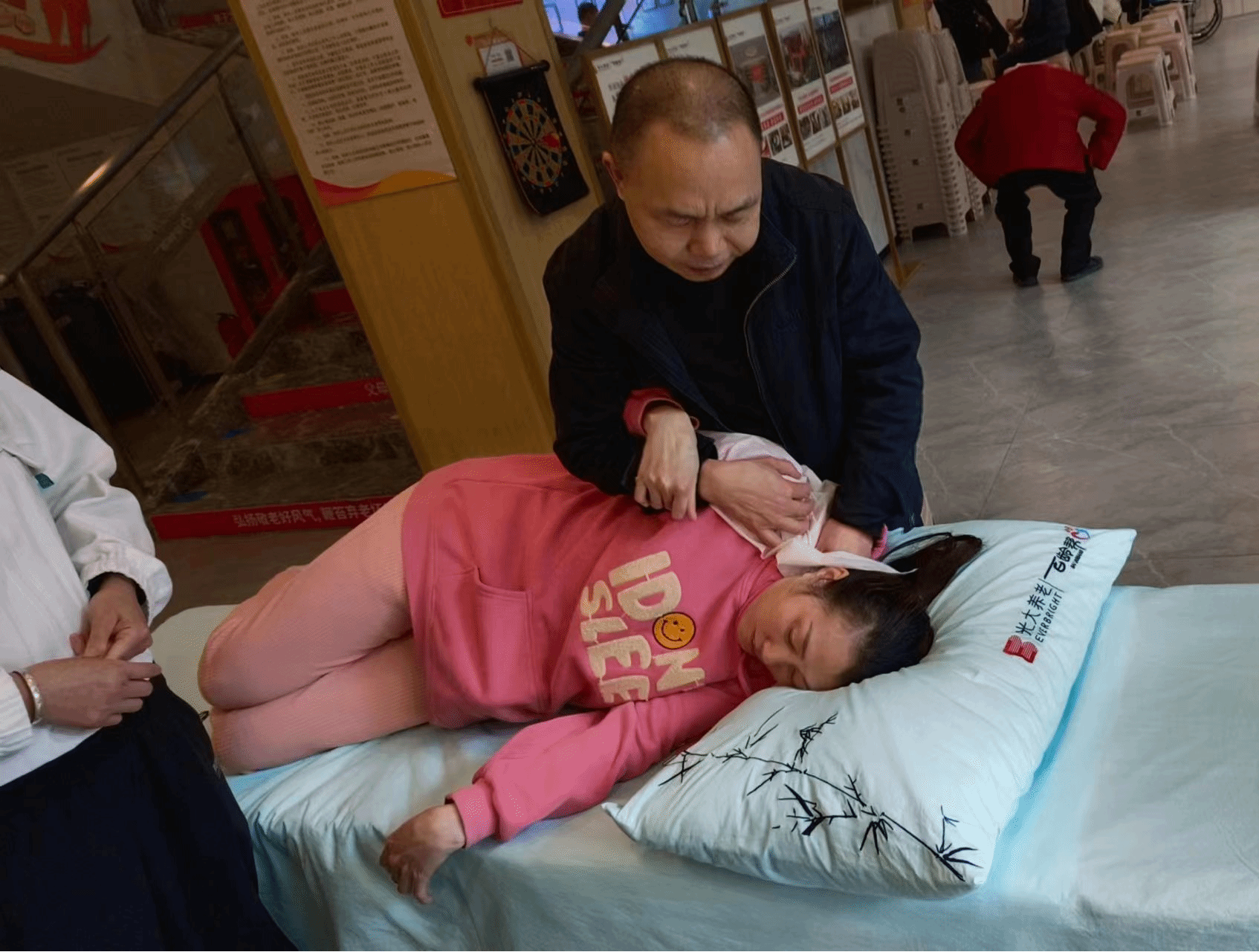 小青为三位按摩老师准备好床位和桌椅,引导老师们为我们展示三大板块的按摩实际操作。小青为视力障碍者们分组进行按摩学习,现场秩序井然,大家都在诚心倾听按摩老师的培训讲解,并拍下学习视频便于随时学习按摩知识。在接受按摩老师的按摩后,视力障碍者们互相交流着体验感受、按摩操作经验。