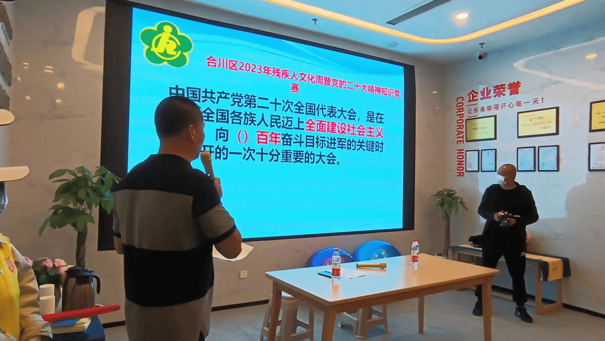 纯粹的理论知识也许让大家对党的二十大精神不够深刻,刘异科长通过“党的二十大精神知识竞赛”检验残障人士关于大家本次党的二十大精神学习成果,活动进行时现场十分活跃,大家积极举手回答问题,而小青也及时为回答问题的服务对象送上参赛小礼品。