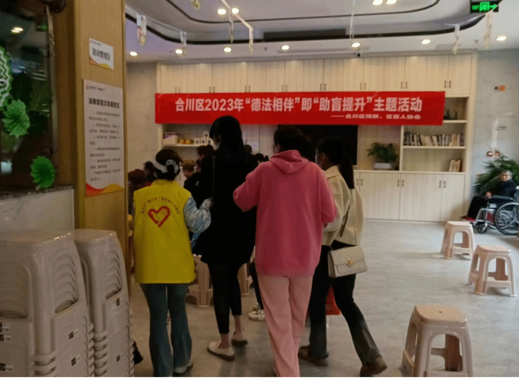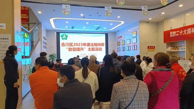 在春风送暖的4月,为丰富长者,特别是残疾老人的日常生活,增强长者的幸福感和归属感,保持健康的生活心态,享受充实且美好的老年生活,4月7日,“馨小青”分队联合合川区残联、合川区盲人协会、钓鱼城办事处在合川区钓鱼城街道养老服务中心,举办了“合川区2023年‘德法相伴’即‘助盲提升’”主题活动”,共同为视力残障人士的健康保驾护航。本次活动共计50余名肢体障碍人士、视力障碍人士参加。