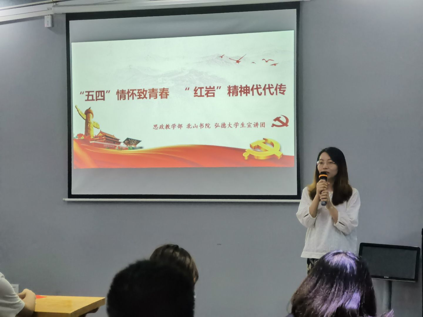 为深入推进我校思政教学部教育思想大讨论工作落到实处,教育引领青年大学生学习先烈革命精神,坚定理想信念,4月27日,思政教学部李潇潇、李佩老师带领弘德大学生宣讲团近30名同学在北山书院开展了第五期“红岩故事接力讲”活动,活动的主题为“五四情怀致青春,红岩精神代代传”。