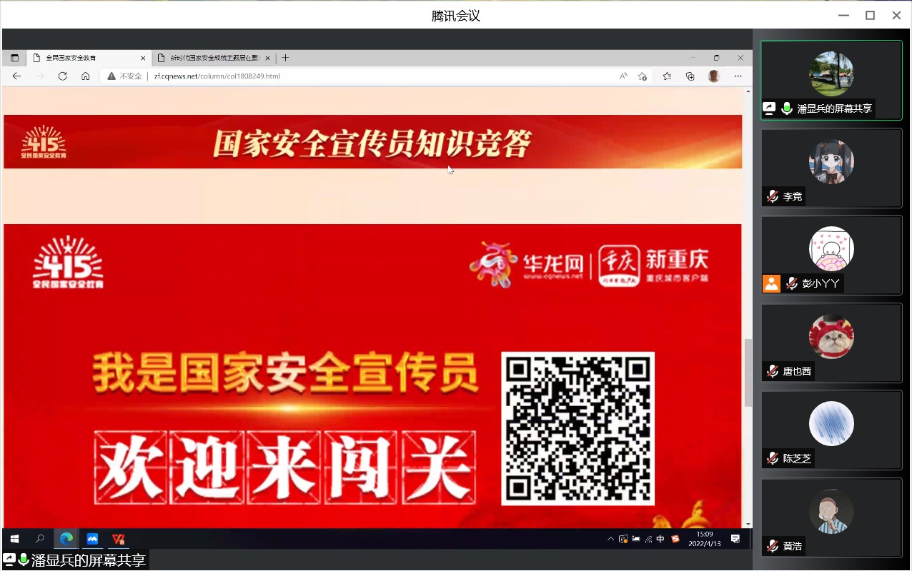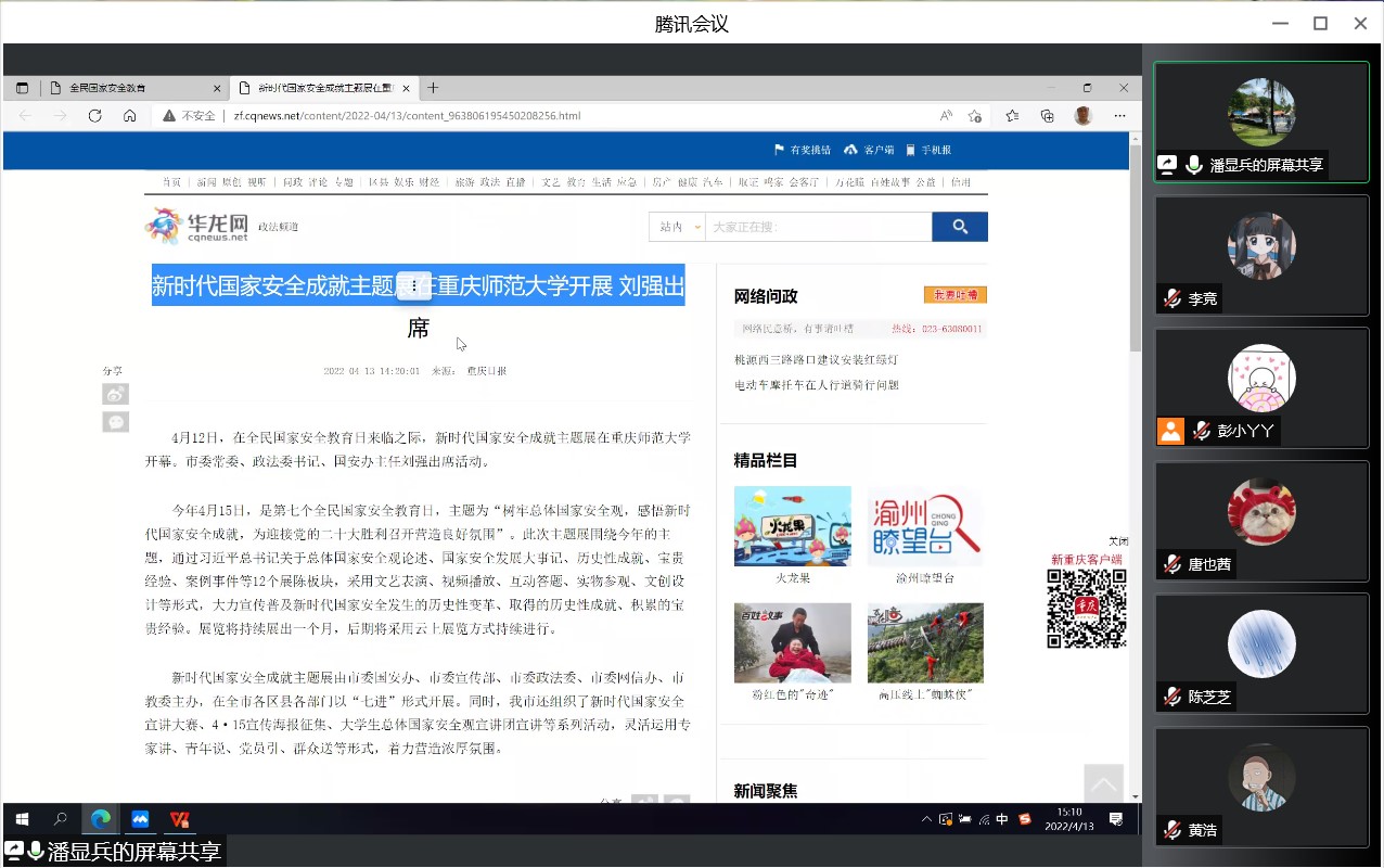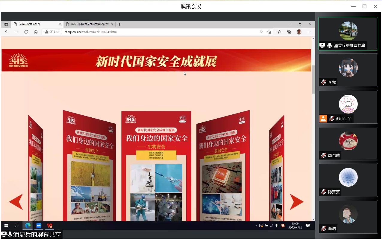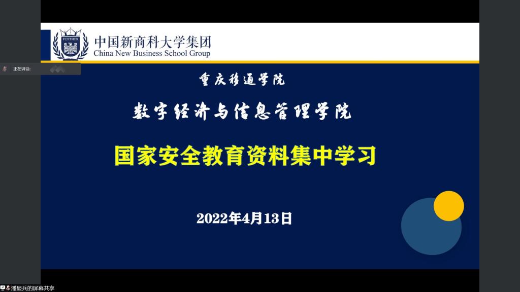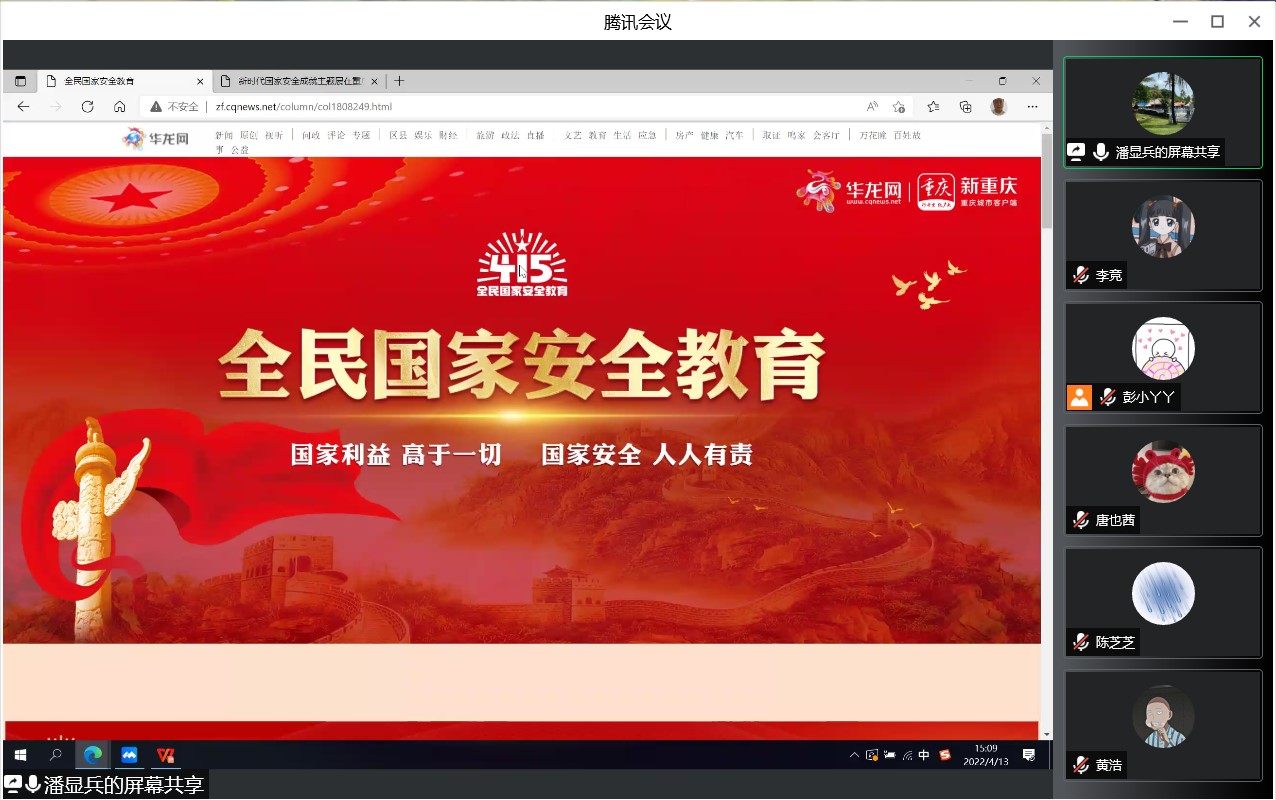 为深入贯彻落实上级相关文件精神,全面深入抓好校园安全管理和师生安全教育工作,进一步增强广大师生安全防范意识,夯实和筑牢国家安全群众基础,形成维护国家安全的强大合力,加强师生的法制观念,进一步推进平安校园、和谐校园建设。4月13日15时,数字经济与信息管理学院全体教师在线上开展了以“国家安全”为主题的教育资料学习会议。本次会议由数信学院院长潘显兵主持。