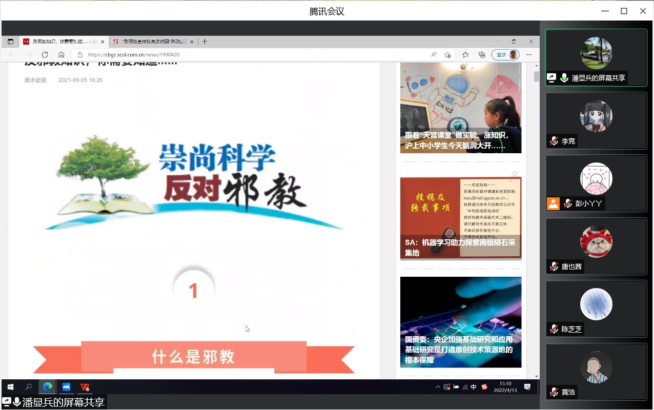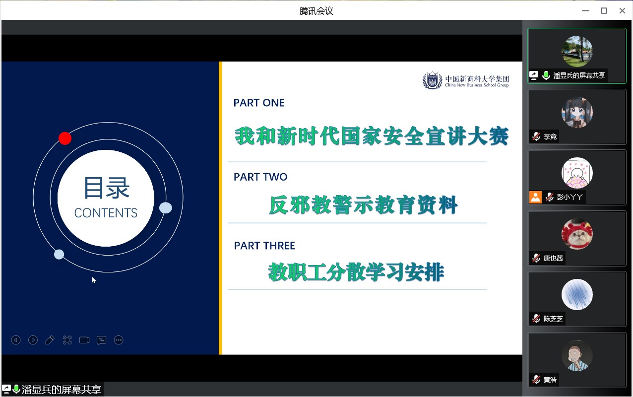 会议开始,潘院长要求全体教师集体组织观看“我和新时代国家安全宣讲大赛”,并积极参与国家安全宣传员知识竞答;动员学生老师们一起学习“千万师生同上一堂国家安全教育课”为主题的公开课,增强师生的安全防范意识;开展反邪教警示教育进学校的宣传片,积极关注反邪教公众号,从认识什么是邪教、邪教是怎么骗人、认清邪教、怎样反邪教、区别邪教和宗教的步骤来提高师生反邪教意识。