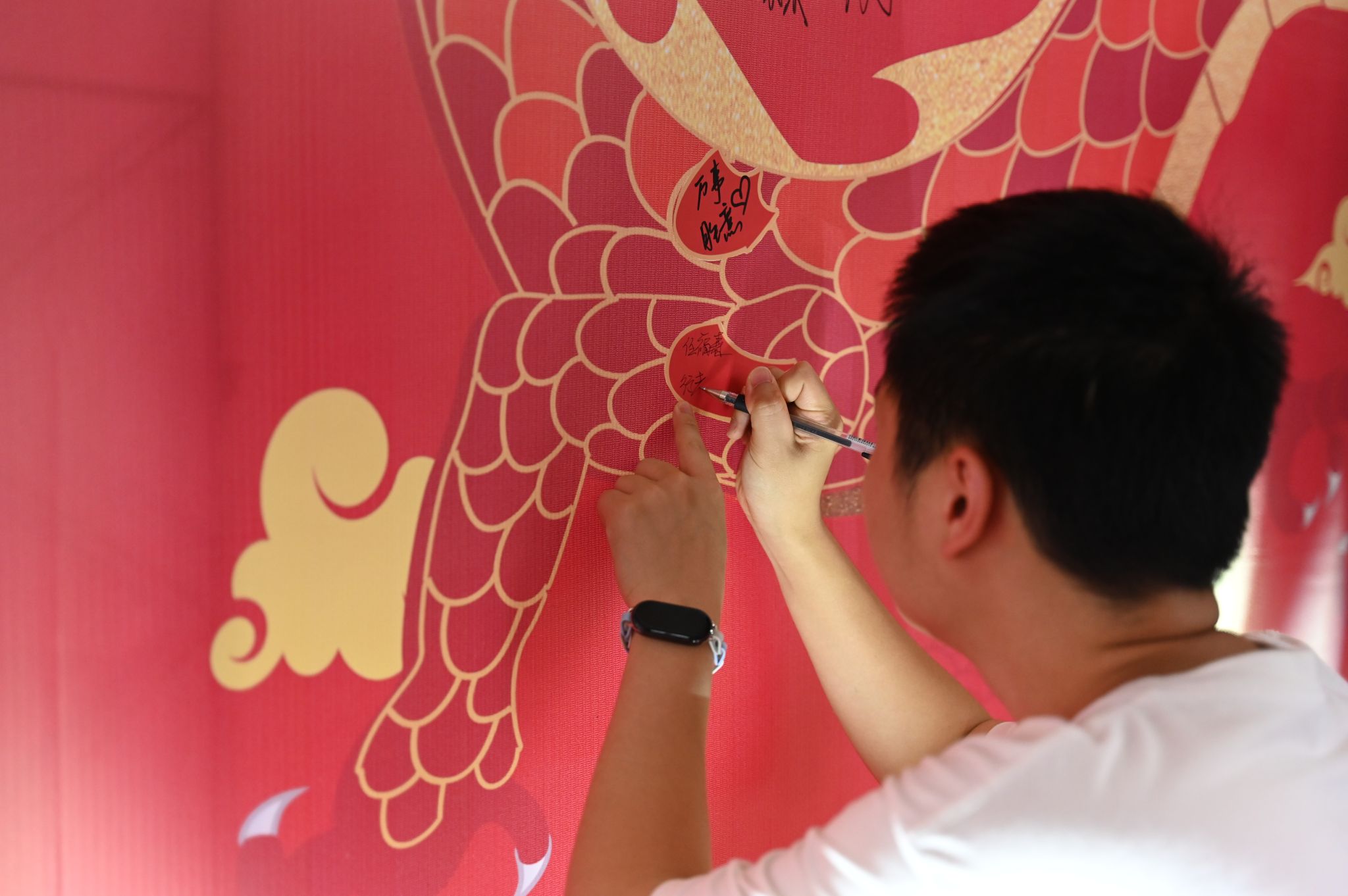 回首过往满地繁花,在一条铺满花饰的花路上,毕业生们步入本次家宴的活动现场,同时也祝愿各位毕业学子未来的道路步步生花,繁花似锦。为每一位受邀前来参加家宴的毕业生们送上一朵生机勃勃的向日葵,愿毕业生们在未来的道路上像向日葵一般永远朝着灿烂进发。龙腾千万里,龙鳞签到墙,希望各位毕业学子在未来的道路上龙腾虎跃,前程朤朤。