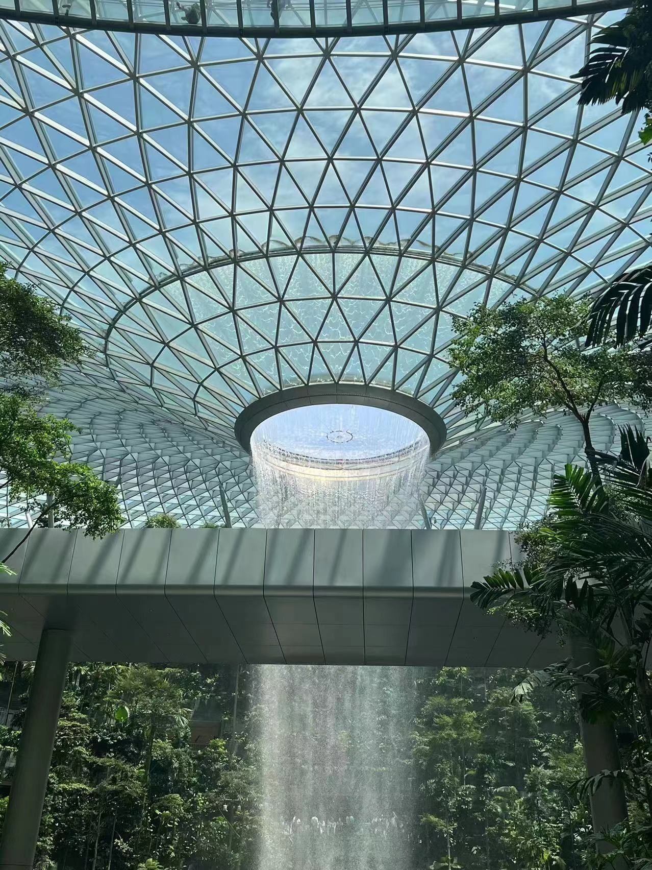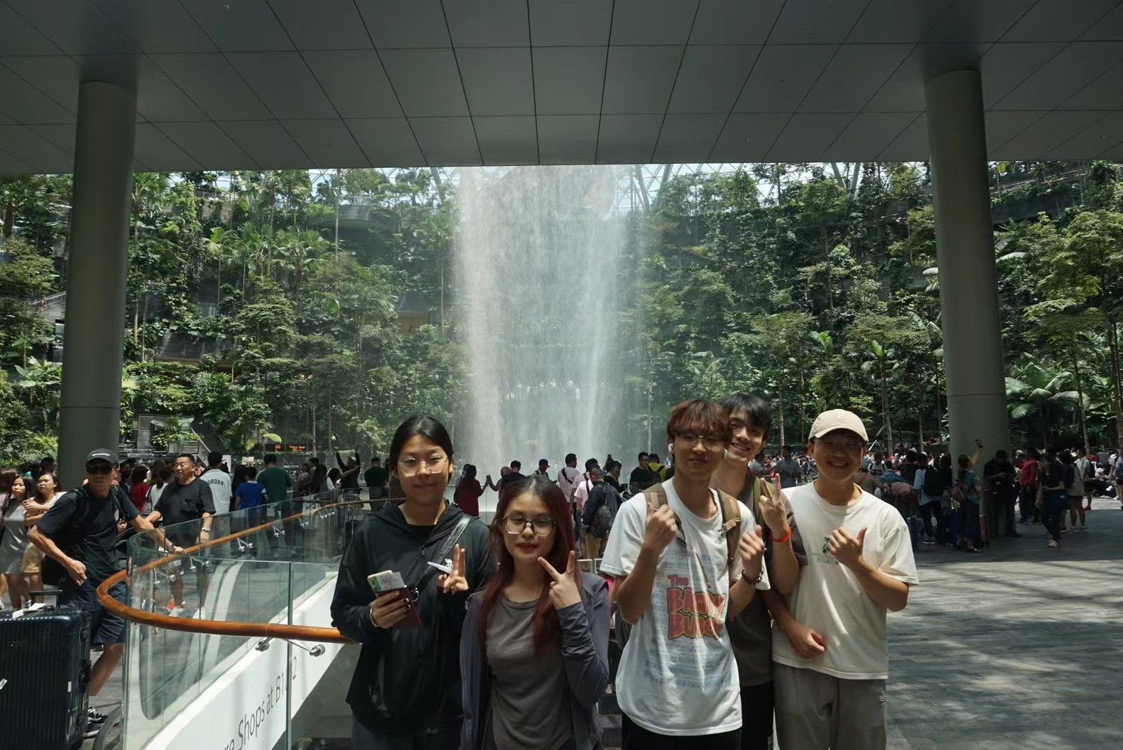 安全到达新加坡樟宜机场后,团队40名成员与全球最大最高的室内瀑布——星耀樟宜留下了第一张大合影。星耀樟宜瀑布每分钟会流下37850升水,水通过顶部的圆孔一直落到地下的水池,完成这场华丽的演出。实际上这些水是通过收集雨水得来的,循环雨水落到水池会通过水泵循环到屋顶然后再重新落下,既环保又充满了科技感,充满了赛博朋克的感觉。