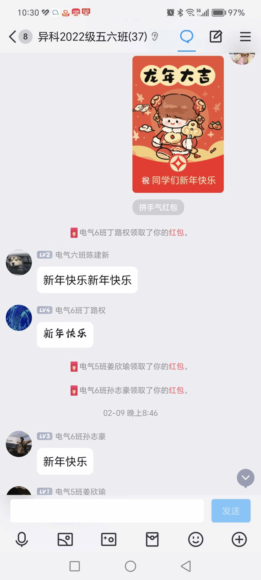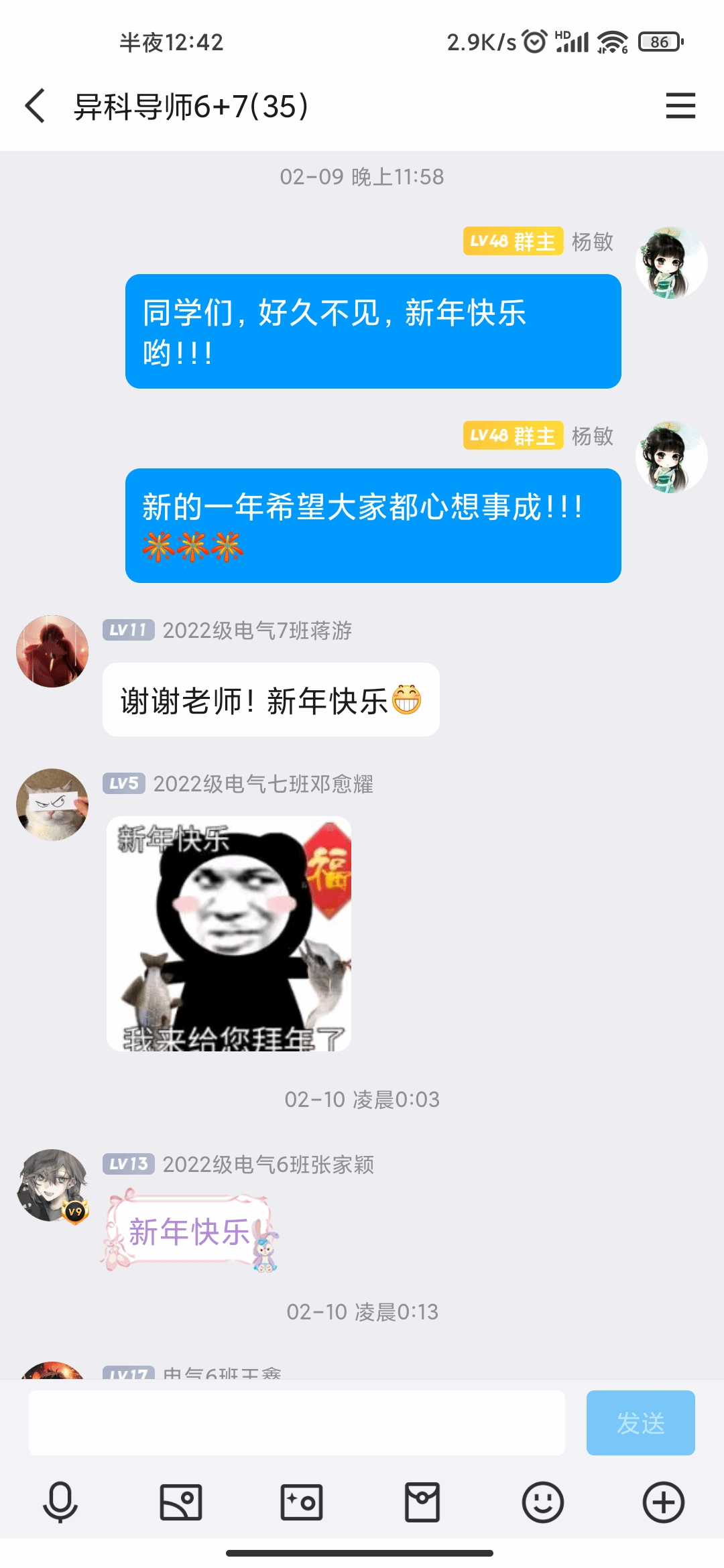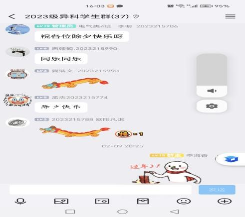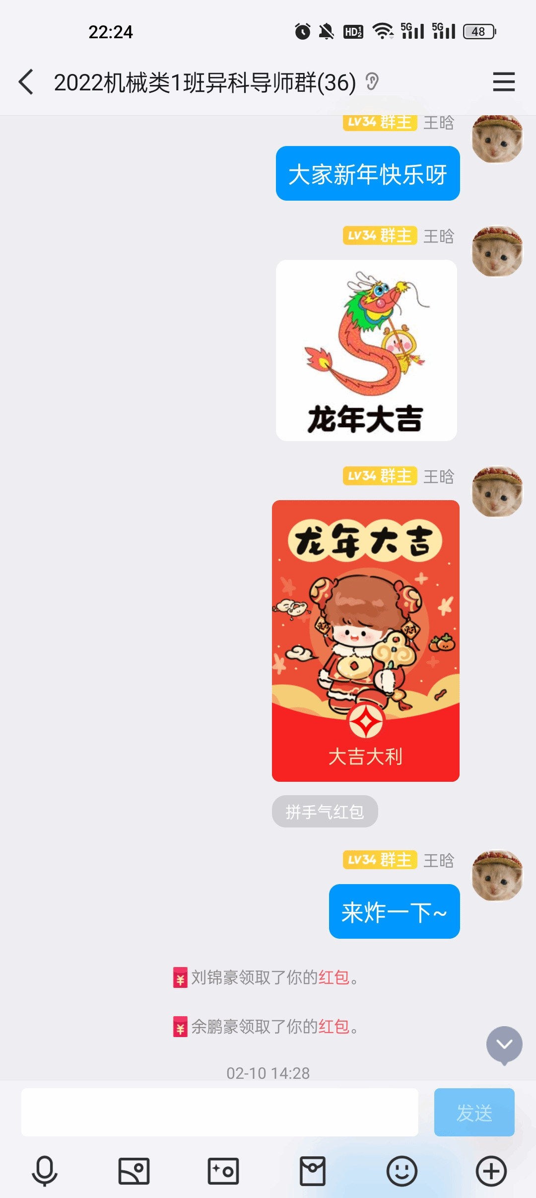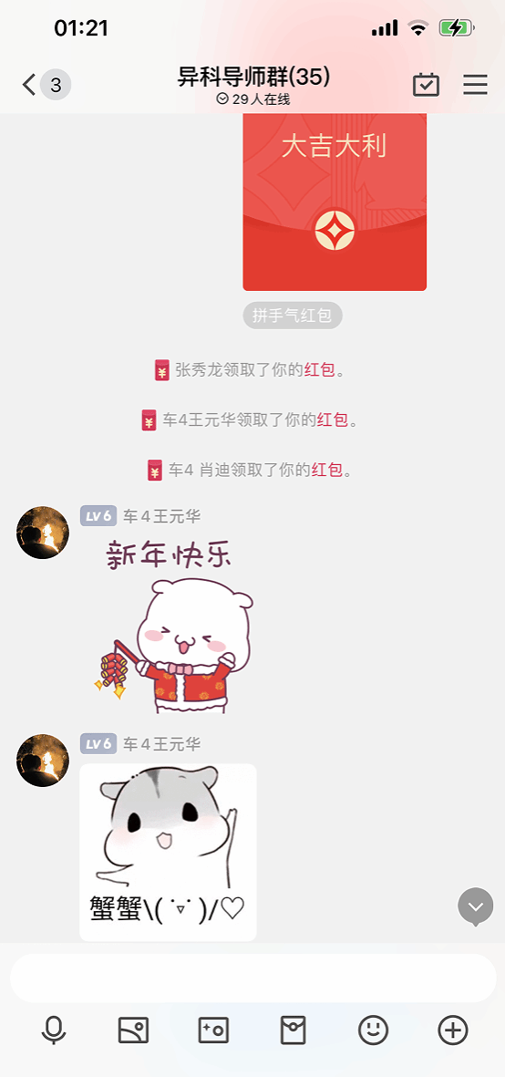 异科导师万江、王晗、何力等多位老师等都于新春佳节在异科学生群里发送了新年红包,与学生一起庆祝龙年的到来,以全新的精神面貌迎接2024年。