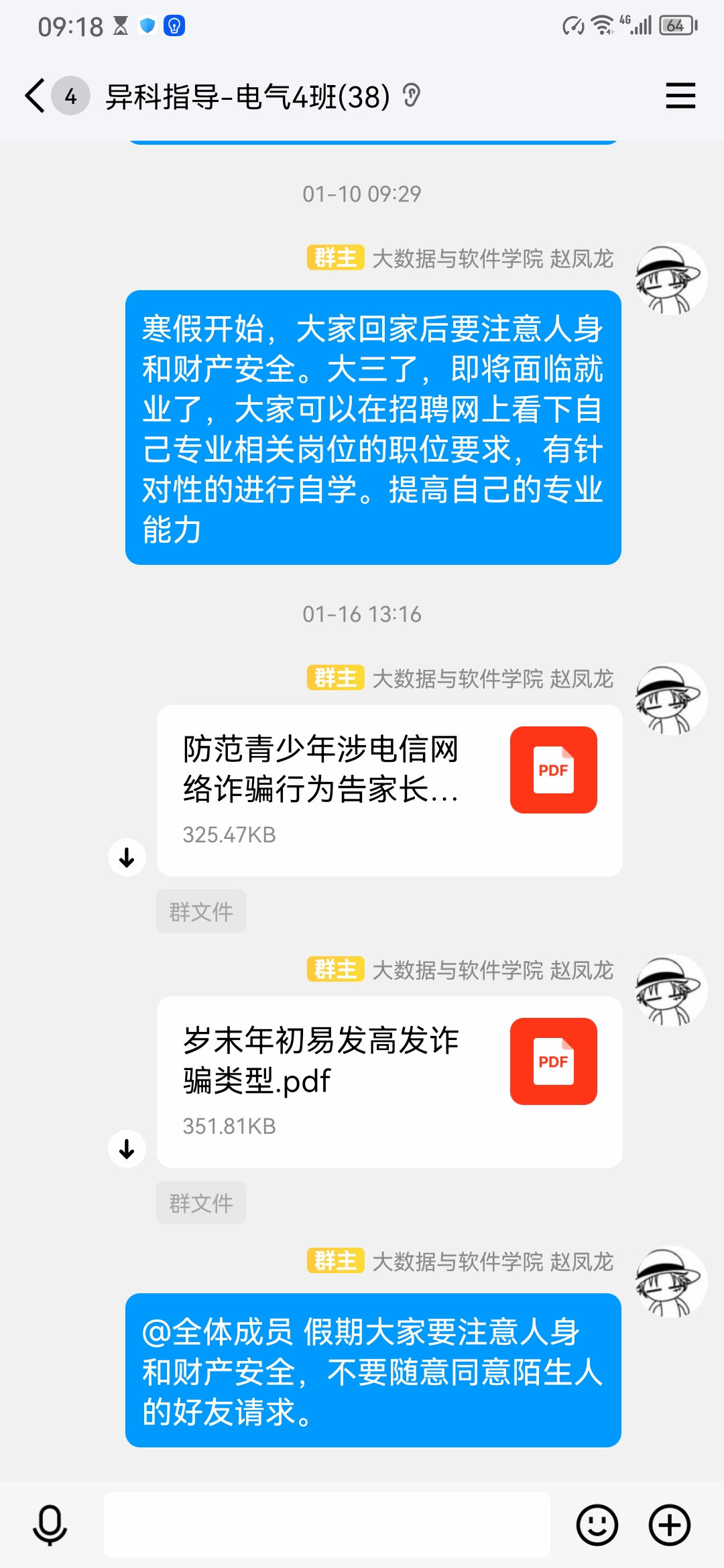 异科导师聂定燕与异科导师谭星在准备放寒假时。提醒同学认真复习,遵守考场规则,争取考出好成绩,过一个开心年,聊聊寒假安排。放假时提醒同学们回家途中注意安全,安全到家后通知一声。在过年期间,和同学们一起守岁,祝福。开学月,提醒需要补考的同学提前复习,准备开学补考事宜,返校途中注意安全,安全到校后在群里发安全到校。