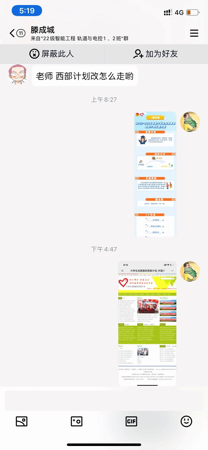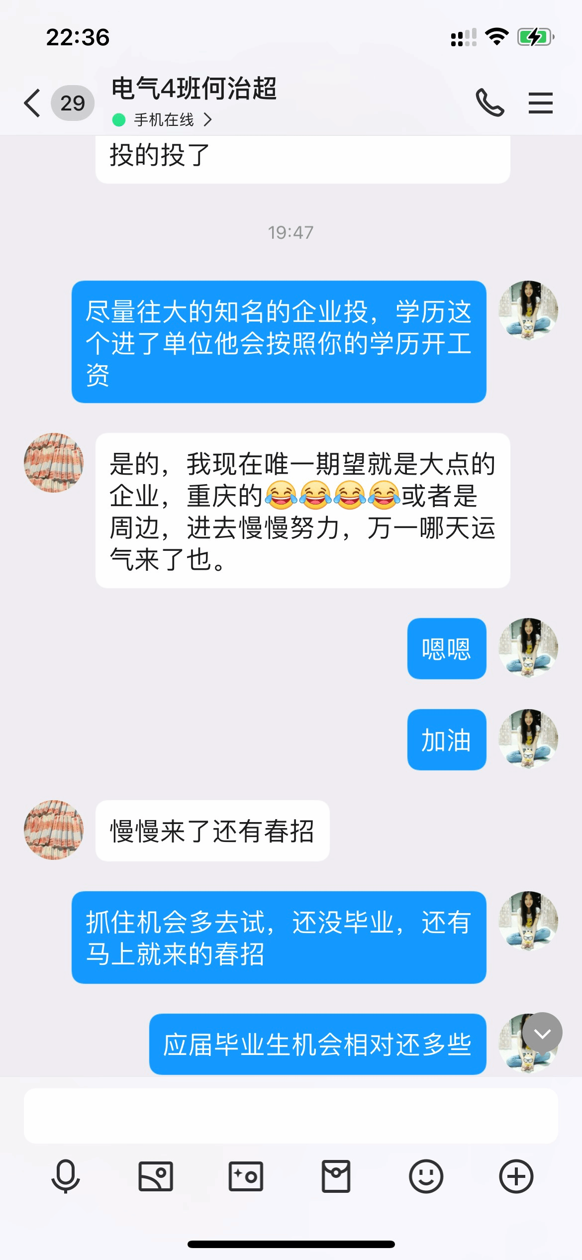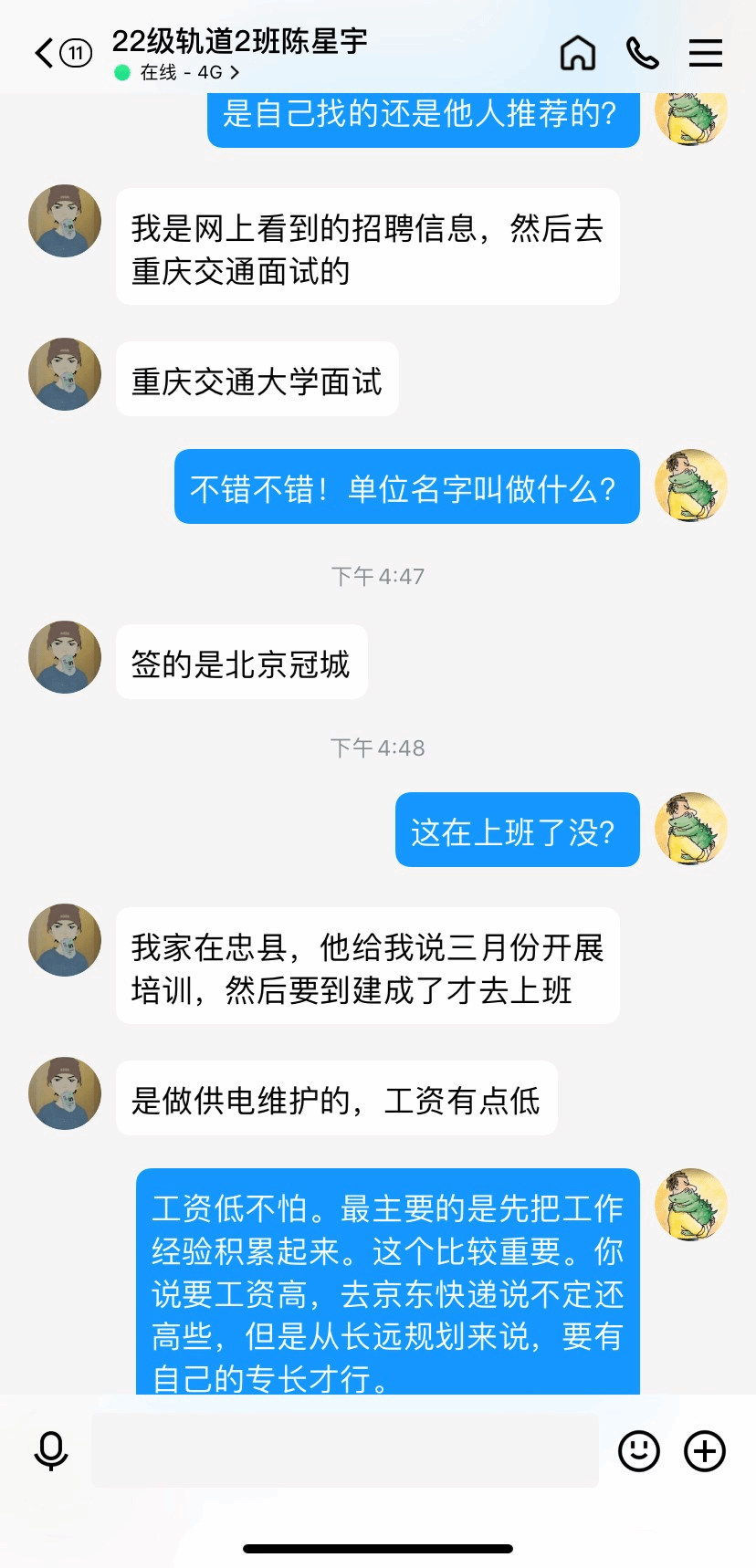 异科导师黄艳在假期通过微信公众号,招聘网站等渠道向毕业班同学推送线上线下各种招聘会,以及相关企业发布的招聘岗位信息。学生咨询军队文职考试,咨询西部计划。给学生转发相关信息,鼓励学生积极备考。
