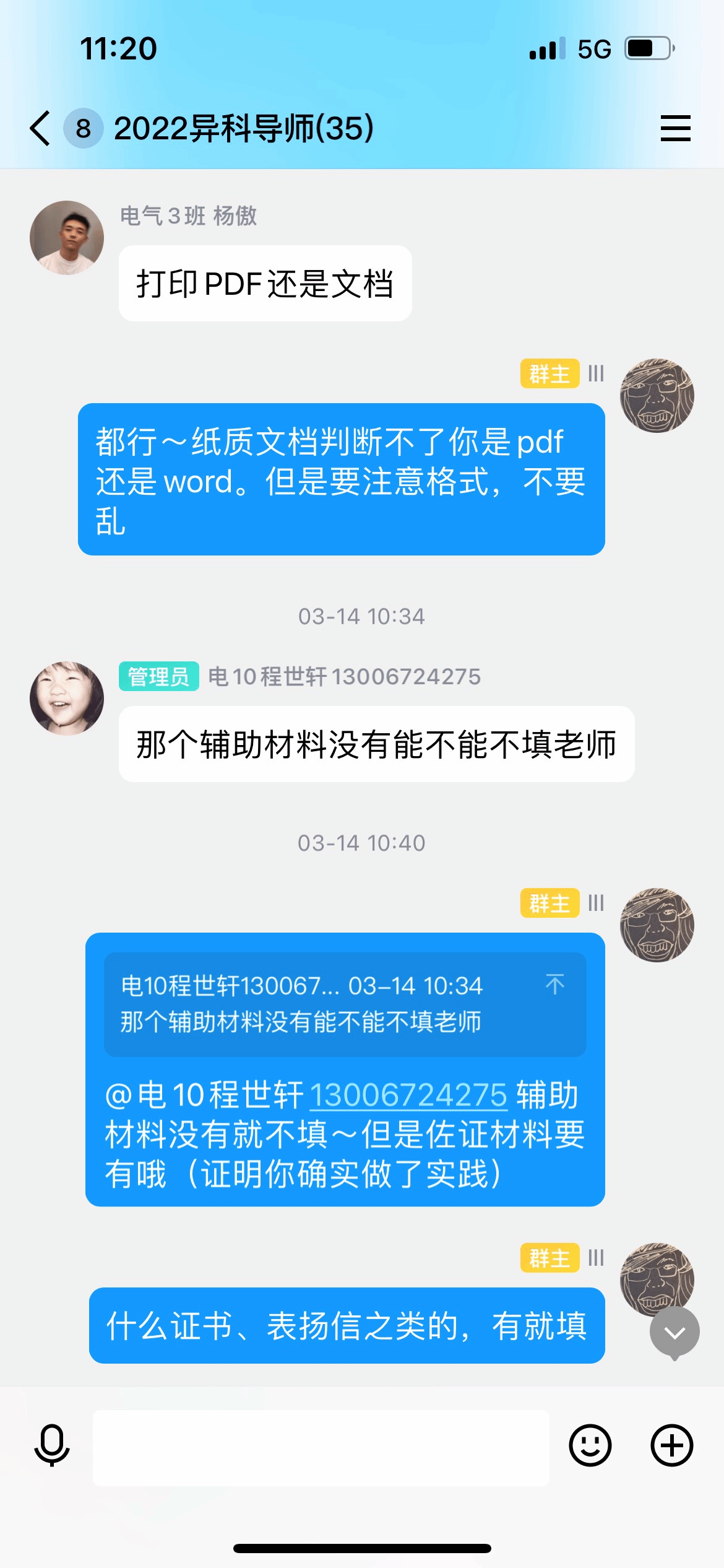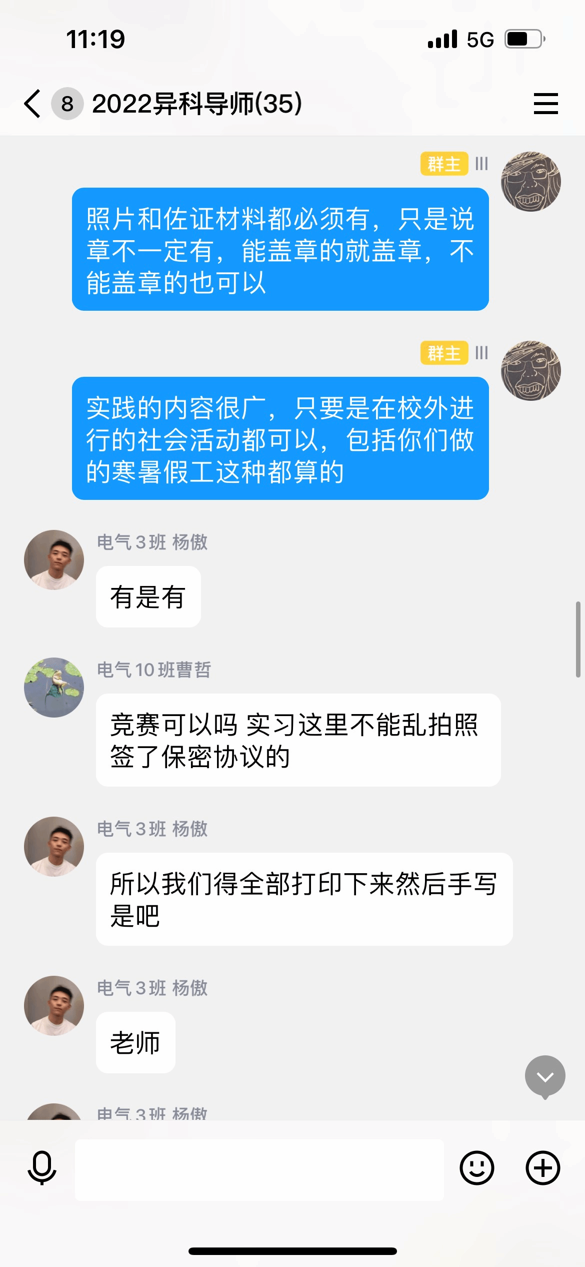 异科导师李华龙对智能工程学院电气工程及其自动化1班的同学开展了社会实践档案线上指导的活动,活动开始李华龙教练对学生实践档案填写中的普遍问题做了指导,比如实践照片的要求,证明材料的规定等等。活动中李教练还对学生在实践中遇到的问题进行了答疑。最后,李教练还给初入职场的同学们送上了祝福。