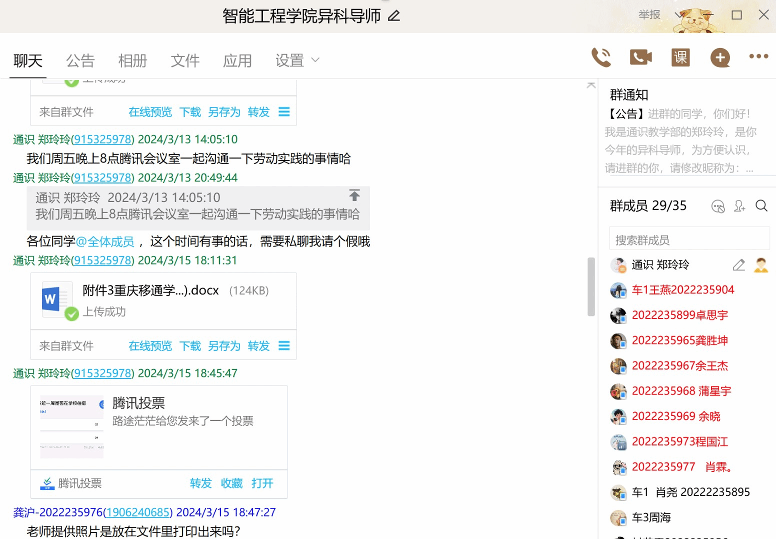 异科导师杜娟为了缓解学生的压力,开展了一系列就业交流和社会实践指导活动;在班级交流群里发布企业招聘信息,双选会信息等,提醒同学们积极准备,抓住就业机会,争取早日签订意向单位。与班里参加实习的同学交流,同学们分享了他们的工作感受,工作环境,工作福利情况等。组织同学们学习《重庆移通学院学生社会实践活动管理办法(试行)》,动员同学们积极参与校内外社会实践活动,指导同学们填写社会实践档案。