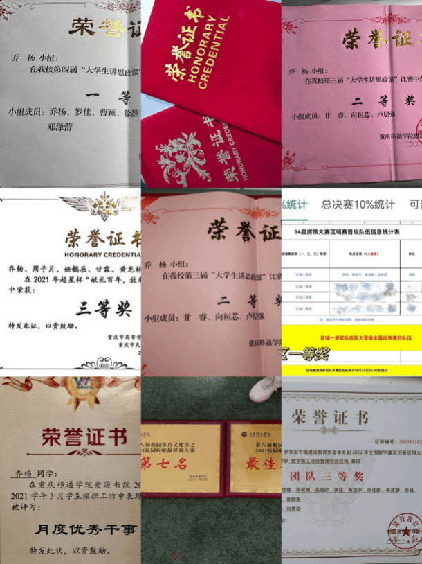 大三我选择退出学生社团,主攻我的专业知识,上课认真听讲、积极参加各类专业比赛,最终也在专业方面取得三个国家级奖项、四个软件证书、一个技能证书。这些成就都要感谢我专业老师的指导与帮助,也很感谢和我一起努力、实验室通宵的小伙伴们,感谢你们的支持与陪伴。