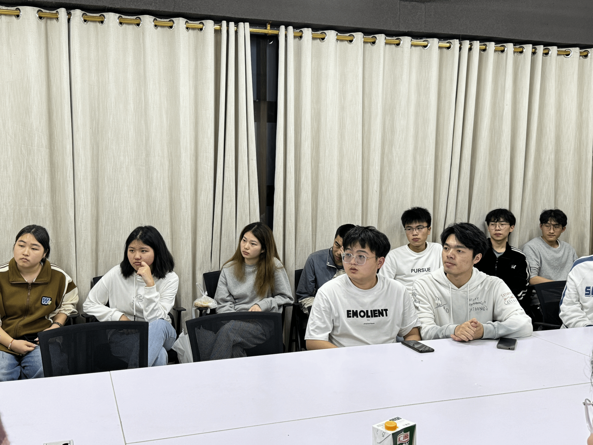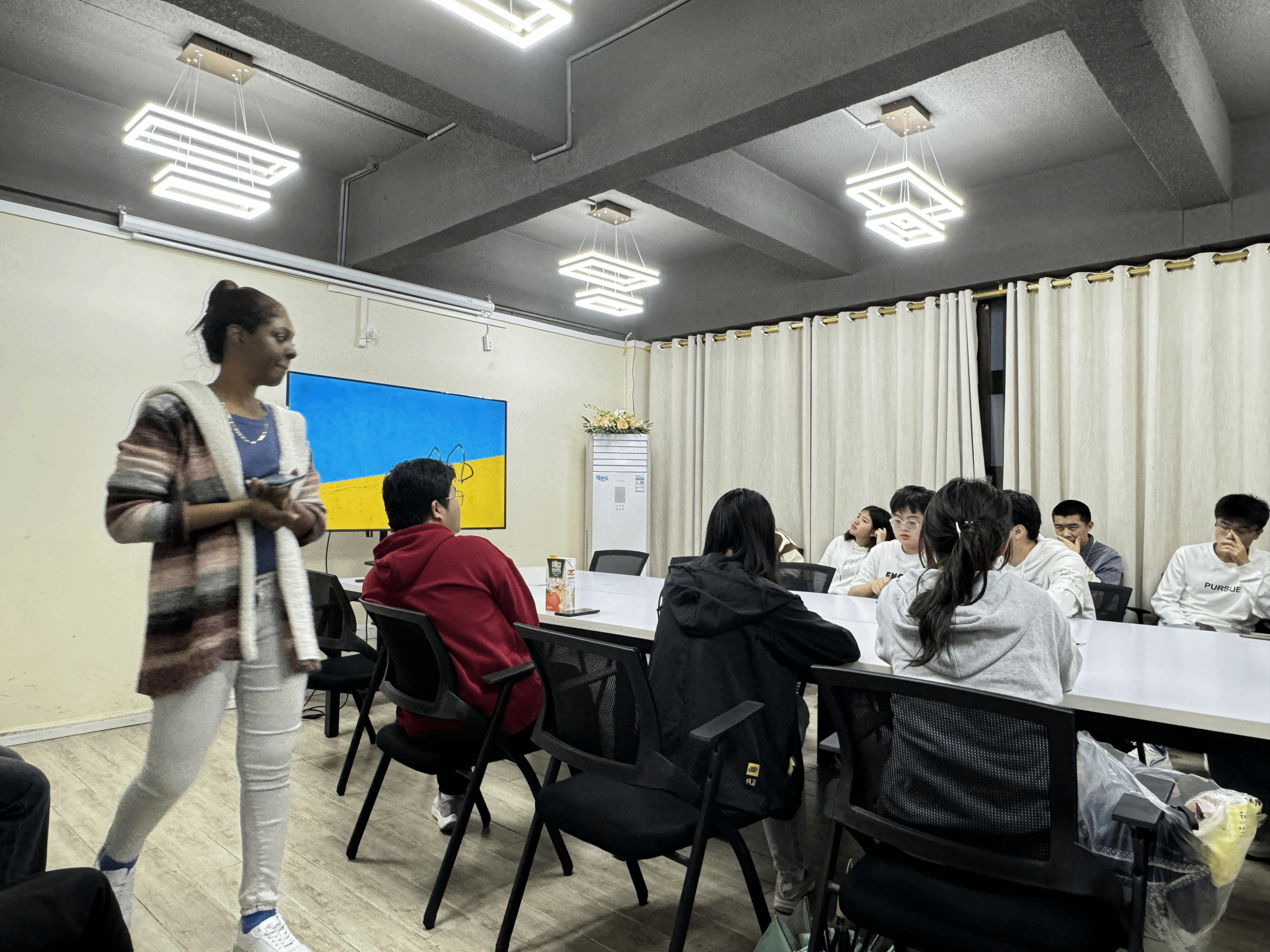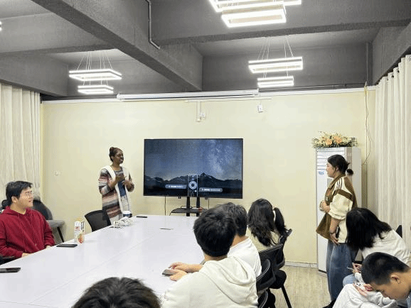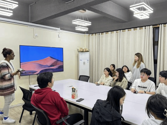 活动伊始,Kristen与来自不同学院的同学们积极互动。Kristen鼓励同学们用流利的英语进行自我介绍,一方面展示他们的风采,另一方面也便于彼此认识。大家围坐在会议桌旁,轻松地展开对话,向外教Kristen热情的介绍自己。