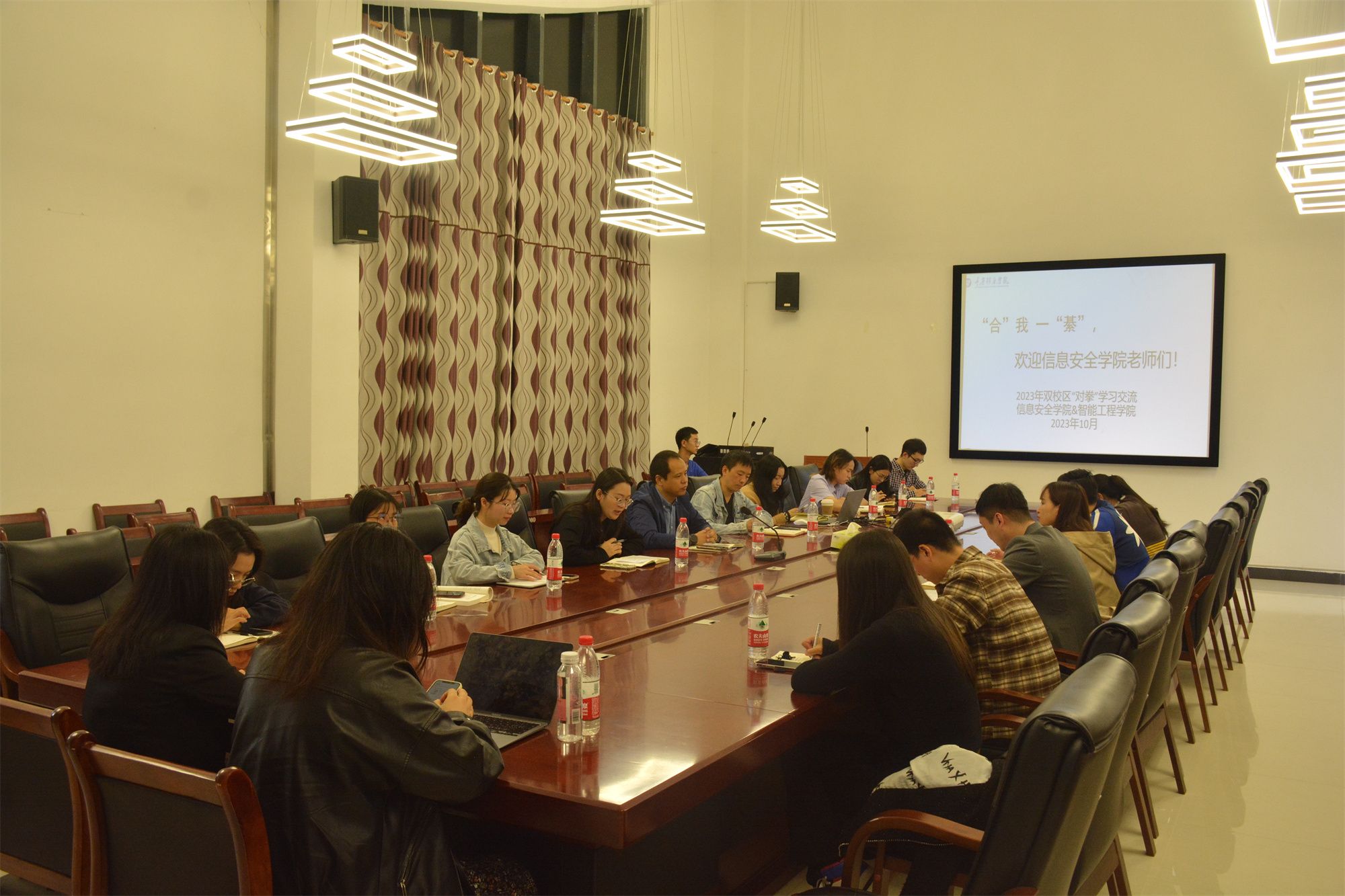 为加强双校区的沟通与交流,互鉴工作经验,进一步提升工作水平,智能工程学院与信息安全学院于10月24日下午两点在合川校区梅若书院207会议室开展“对拳”学习交流会。智能工程学院学工副院长祝玮、学生工作办公室主任刘桃、就业创业办公室主任扶小琴和信息安全学院学工副院长尹金维、学生工作办公室主任邹健以及两院各板块、各年级辅导员参加本次交流会。