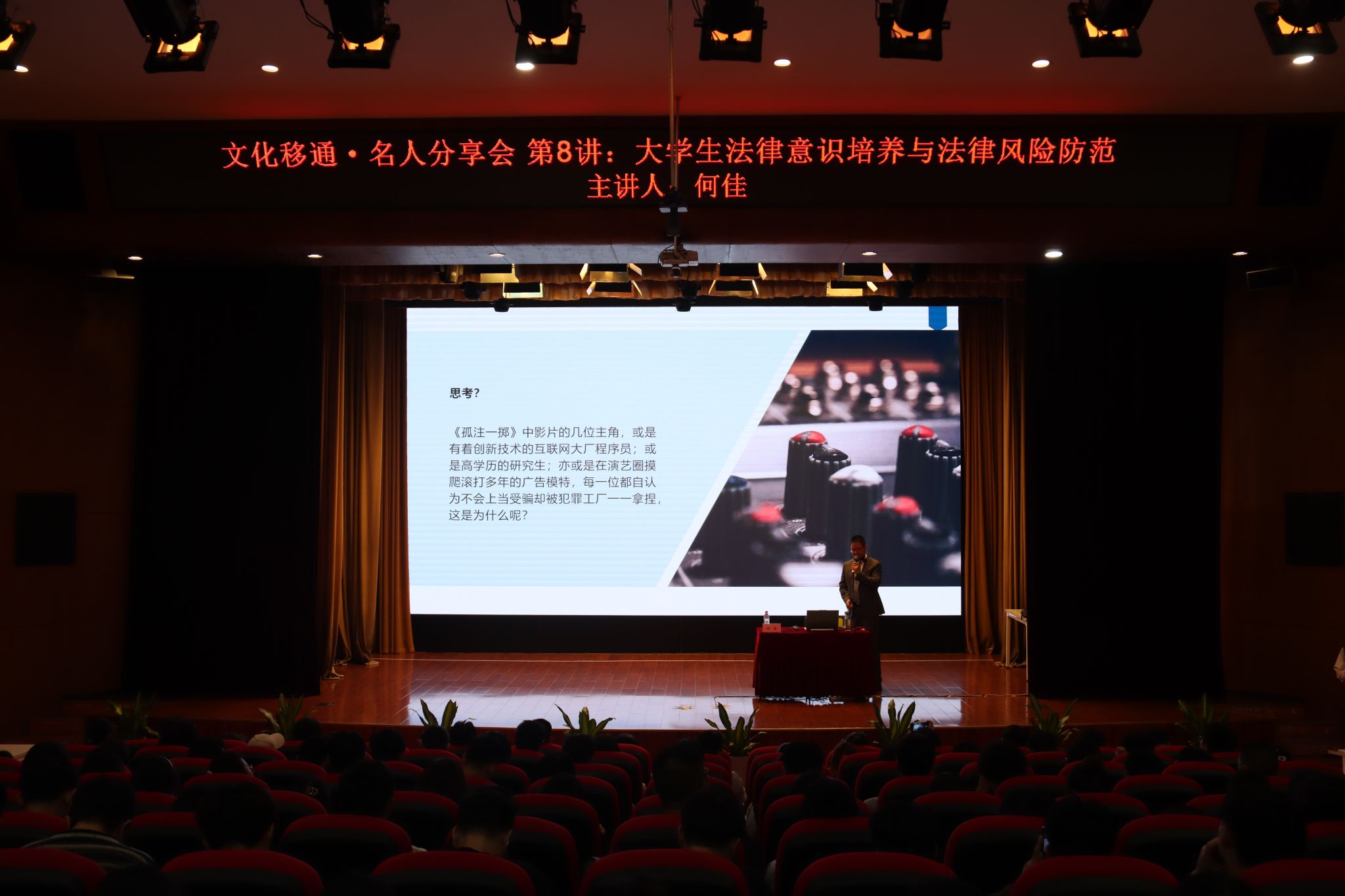 10月10日晚19:00,何佳律师做客“文化移通——名人分享会”,在下里巴人剧场开展了以《大学生法律意识与法律风险防范》为题的讲座,何佳律师用大量真实案例,为移通师生们带来了一场精彩的知识盛宴。