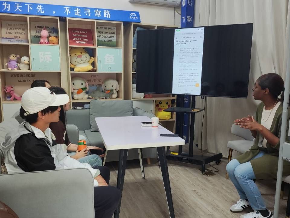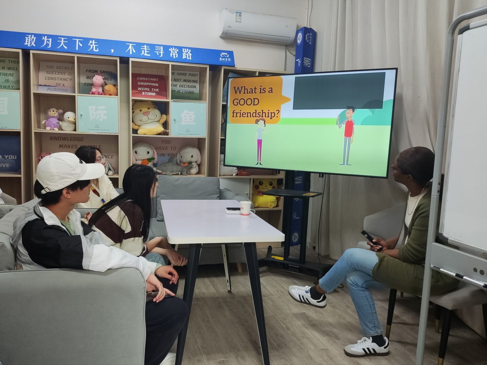 在讨论环节,Kris老师强调了友谊在克服文化和语言障碍中的价值。“友谊是一种超越语言障碍的通用语言” Kris老师说道,“今天,我们不仅仅是在练习英语,我们还在建立理解和支持的桥梁。”她准备了一系列与友谊相关的对话问题,如“你认为友谊对你来说意味着什么?为什么?”、“友谊是如何影响你的日常生活?”等。同学们纷纷踊跃发言,用英语表达了自己的观点和看法。Kris老师耐心倾听,不时给予鼓励和纠正,帮助同学们更好地掌握英语表达技巧。