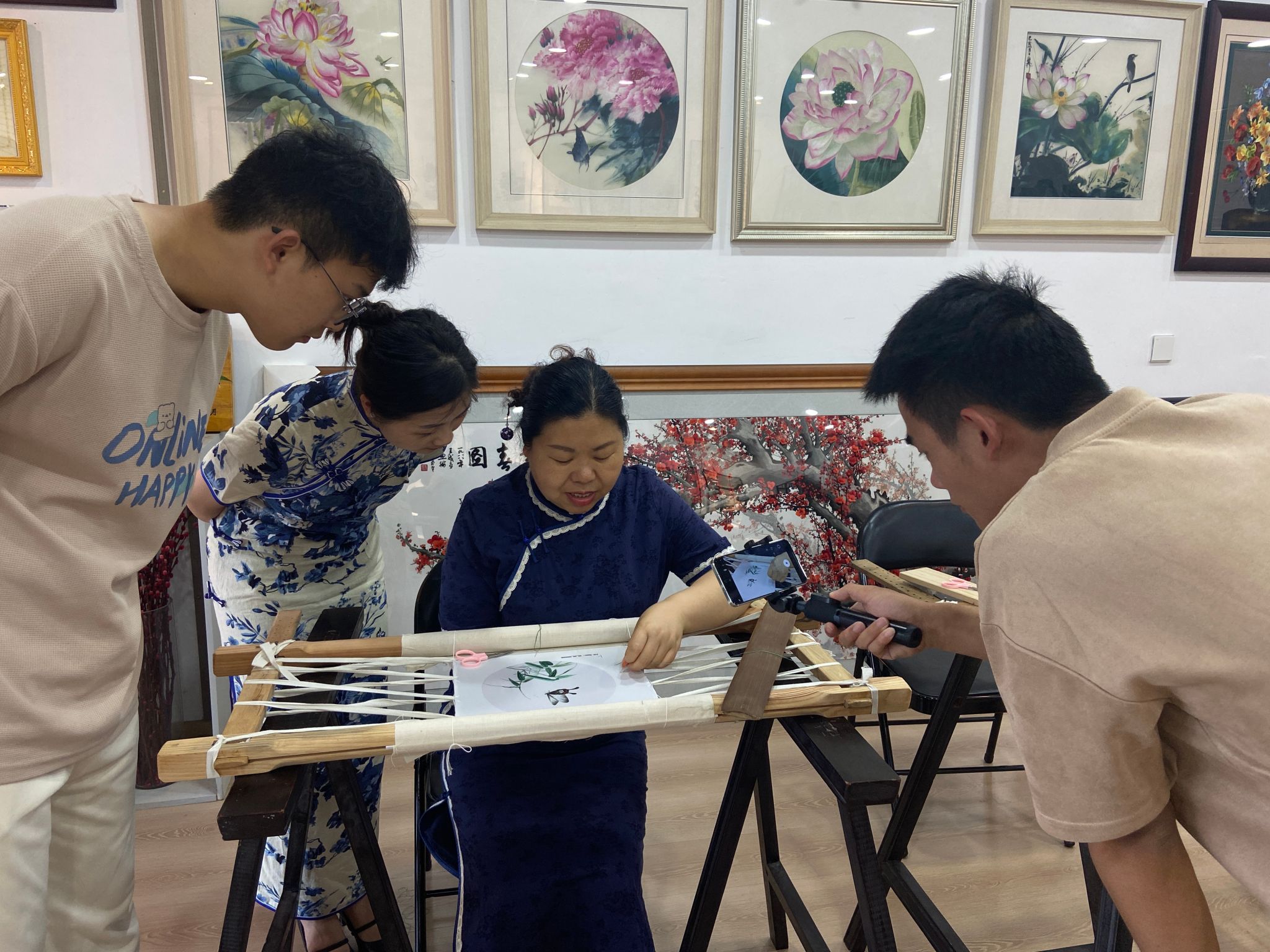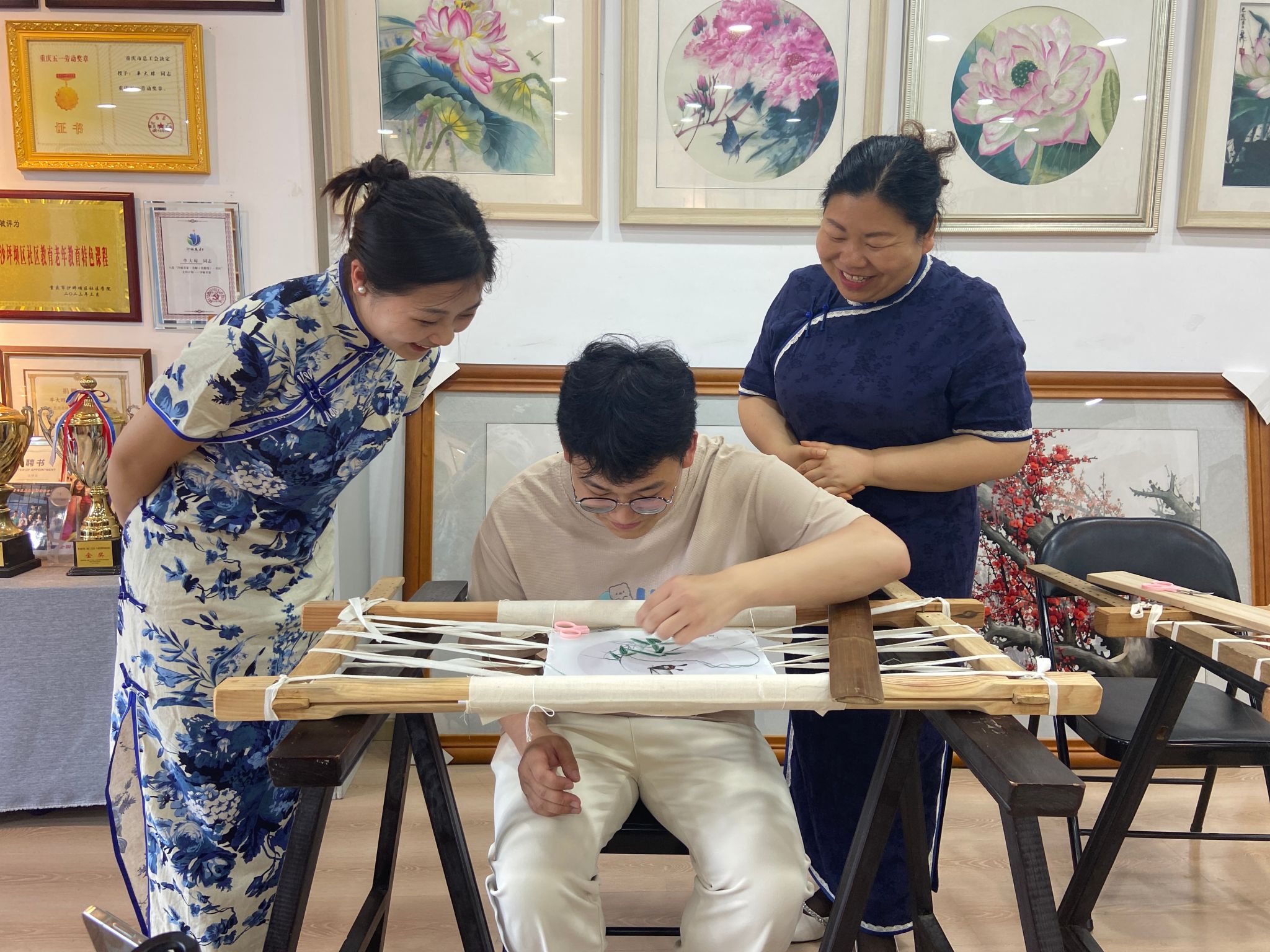 在单老师的指导下,同学们尝试拿起针线在绣绷上练习。单老师及时纠正了同学们的不熟练和不准确之处,并分享了刺绣的秘诀和正确姿势,俗话说“百炼成钢”,只要在刺绣前期时在没有图案的布上常练下针与出针,日复一日,自然就熟练了。大家还说自己看不清楚出针在哪里,都有近视,绣的时候眼睛都要贴到绣布上去了,单老师指出正确的刺绣姿势应是眼睛离绣布三十厘米远。单老师即使刺绣几十年,眼睛依然没有近视,出针下针又快又准。