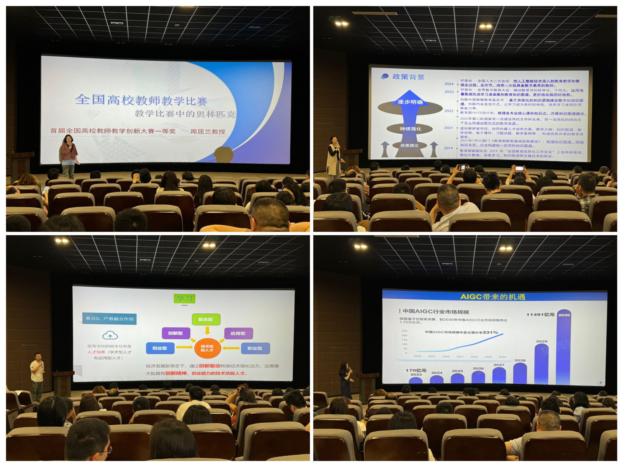 会议中,王宝珠老师深入介绍了周屈兰教授的“精准复盘:往届获奖选手视角下的教学创新大赛”主题报告,探讨了新工科背景下电子信息类课程教学改革的方向,并分享了创新教学方法和实践技能培养的有效途径。胡珺珺老师分享了周屈兰教授的“基于知识图谱与AI技术的教学创新应用”主题报告,普及了知识图谱的概念,并展示了如何利用人工智能(AI)技术设计高效的教学活动,以激发学生的学习兴趣和提升教学效果。张辉老师从个人培训体验出发,分享了王军选教授的“产教融合,切实提升本科培养质量”主题报告,强调了校企合作的重要性,并探讨了如何紧密结合行业需求来设计课程和调整教学内容,以提高教育质量和学生的综合素质。杨慧娉老师聚焦于王军选教授的“AIGC带来人才培养的挑战与机遇”主题报告,讨论了AIGC技术在教育领域的挑战与机遇,并分享了如何有效合理地利用AIGC技术辅助教学,促进学生的全面发展。通过这些教师代表的分享,全院教师获得了宝贵的教学经验和启发,对如何将新工科教育理念应用到实际教学中有了更清晰的方向。