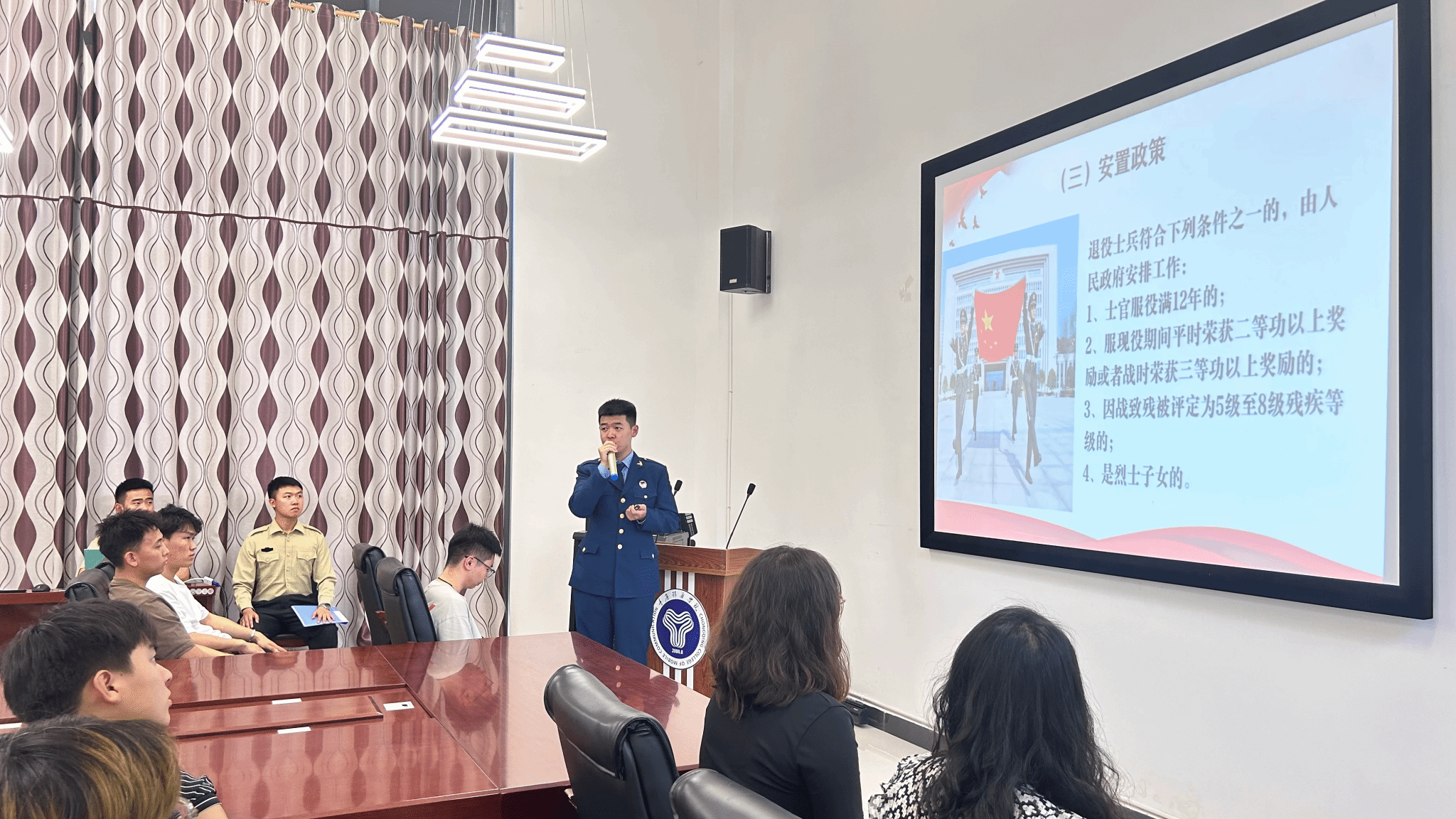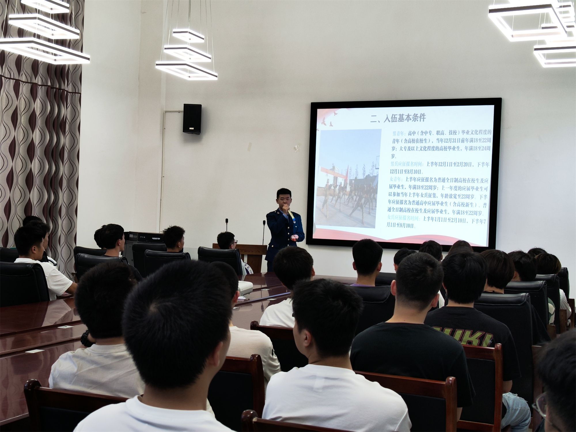 为贯彻落实《一年两次征两次退役改革实施方案》《关于加强和改进新形势下征兵宣传工作的意见》的文件精神,智能工程学院积极落实学校关于征兵工作的各项部署,扩大征兵宣传的影响力和辐射面,弘扬热血青年追逐青春梦想、投身强军兴军的国家情怀,激发我院大同学携笔从戎、报效祖国的热情,智能工程学院国防教育宣讲团联合院就业助理团,于5月15日在梅若书院207会议室举办了“热血筑军魂,青春献国防”2024年秋季征兵宣讲会。参加会议的有院国防教育宣讲团指导老师杨铭、智能工程学院辅导员邵燕丽、方港利、校国防教育宣讲团骨干于佳辉及院就业助理团代表张昊卓以及各年级各专业有意向入伍、有军旅梦的同学们,会议由院国防教育宣讲团骨干文迪主持。