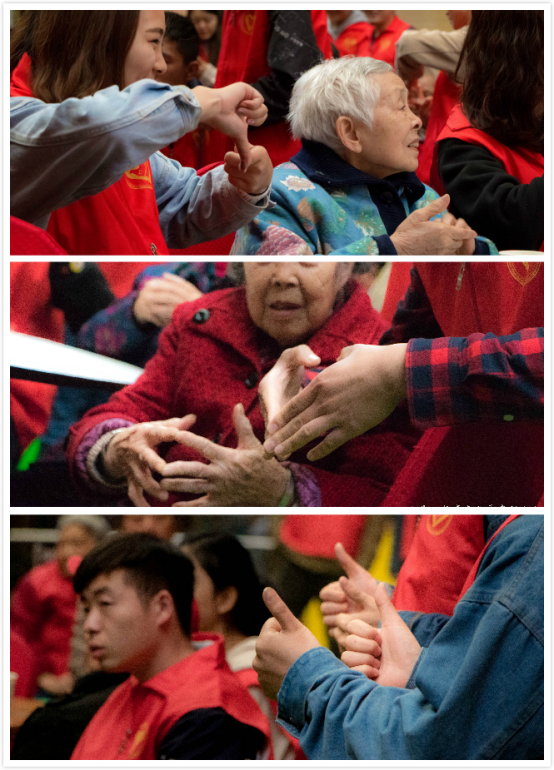 小品《粮票》中志愿者认真表演,生动地展现了老人所处计划经济的时代,从老人所长大的环境来进行表演,既能够引起老人们的回忆,又能让老人感受到幽默,这些细节都表达着志愿者们对老人无微不至的关心。在最后志愿者教老人们做手语操——《中国很赞》,简单的动作,老人努力的“追赶节拍”,情不自禁地笑出了声。虽然志愿者的能力有限,但却用自己的实际行动赢得了老人们会心的微笑和热烈的掌声。