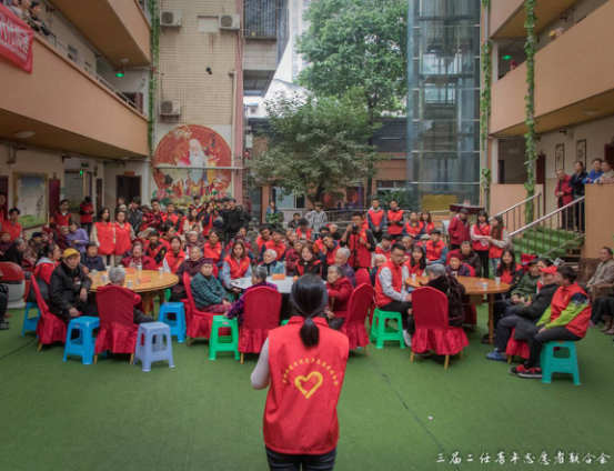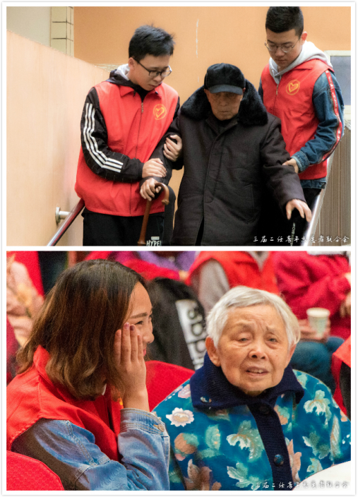 在下午三点左右,青春伴夕阳节目秀就开始了。志愿者把中央庭院的桌椅摆放整齐并搭建一个简易的舞台,纷纷悉心搀扶老人们入座并向老人递上一杯杯热茶。简单的开场秀,节目依次有计科系爱心团支部带来的《学习雷锋》、志愿者的深情历史故事演讲《黄继光》、一位志愿者写给远在家乡的爸爸妈妈的《家信》、四名志愿者深情演唱的《当你老了》、《相亲相爱》、还有接地气的小品《爷爷的故事》给老人们带去了无限的欢乐。