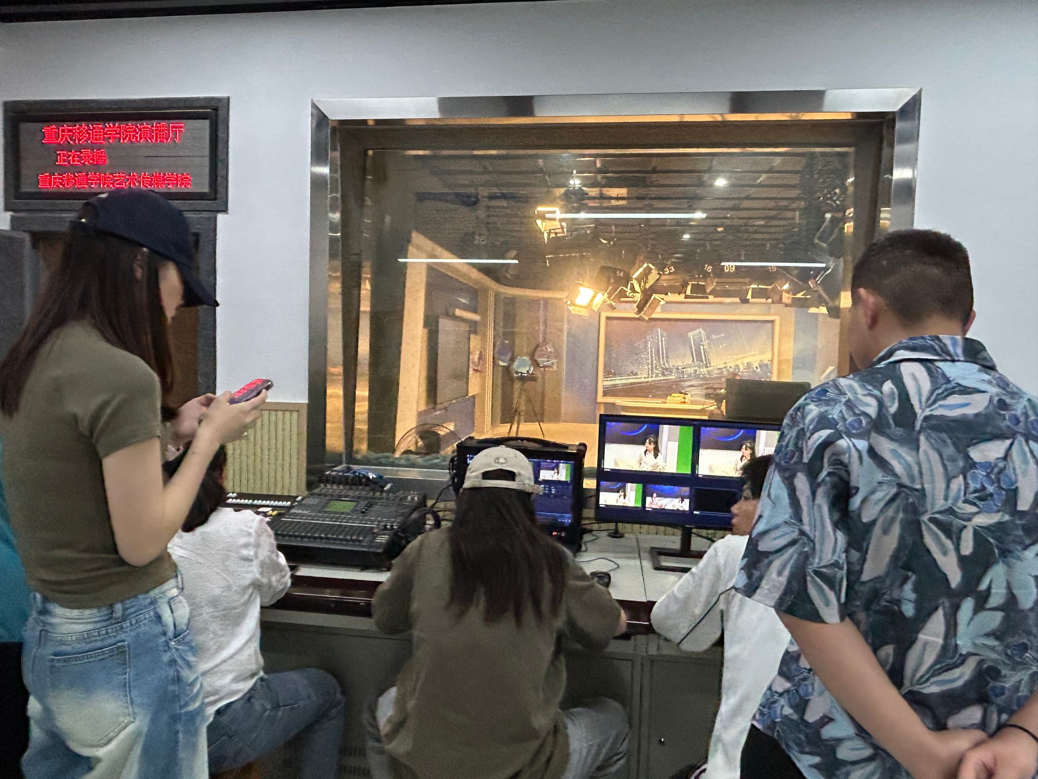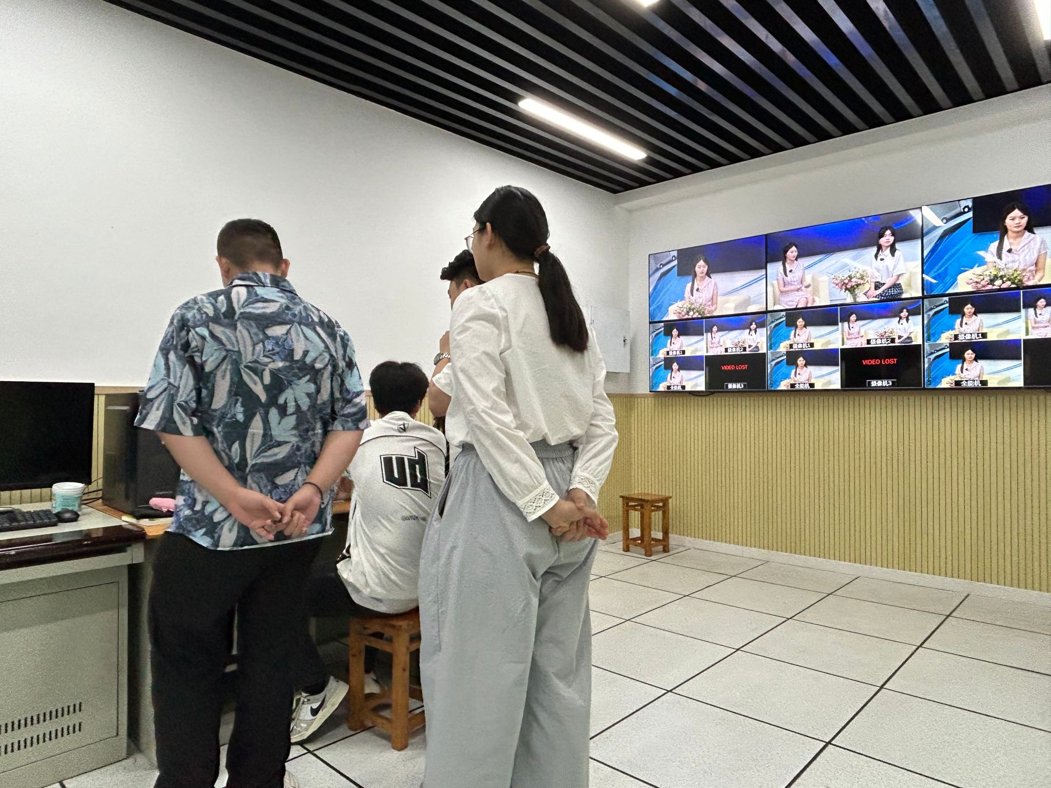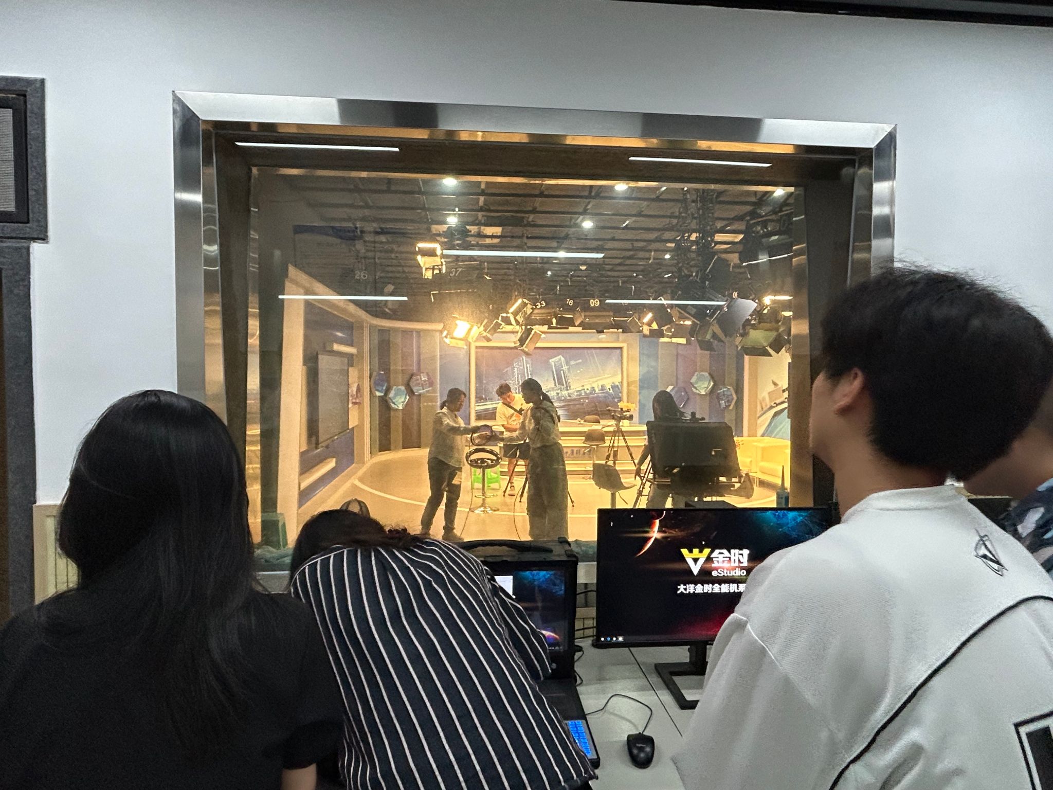 与此同时,段涵荠老师带领部分异科学生走进了学院演播厅的幕后,亲身体验了一档文化谈话类节目的诞生过程。学生们在导播室听取了节目制作团队对节目制作流程的介绍,随后进入演播厅,近距离观察节目的录制过程。