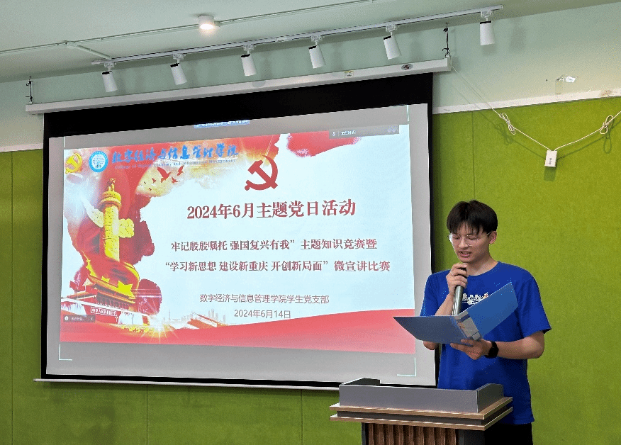 为进一步深入学习贯彻党的二十大精神,激发广大党员的责任感和使命感,数字经济与信息管理学院第一、第二党支部于6月14日15:00在双栀书院多功能影音室开展6月主题党日活动,活动以“牢记殷殷嘱托 强国复兴有我”知识竞赛暨“学习新思想 建设新重庆 开创新局面”微宣讲比赛为主题开展,支部全体在校党员参会。