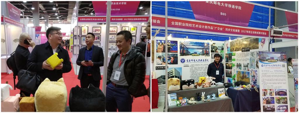 2017年12月22日至24日,由教育部职业院校艺术设计类专业教学指导委员会主办的“全国职业院校艺术设计类作品‘广交会’同步交易展暨2017年校企创新成果对接会”在广州琶洲国际采购中心举行。我校作为重庆地区唯一教学单位,携手凤凰传媒,受邀参加本次广交会,并设立单独展位,展出近年来艺术传媒学院优秀产教融合成果。学校董事陈总,就创中心主任陈仲华,艺术传媒学院院长王鹤、动画教研室组长黎珂位作为学院代表出席了活动。