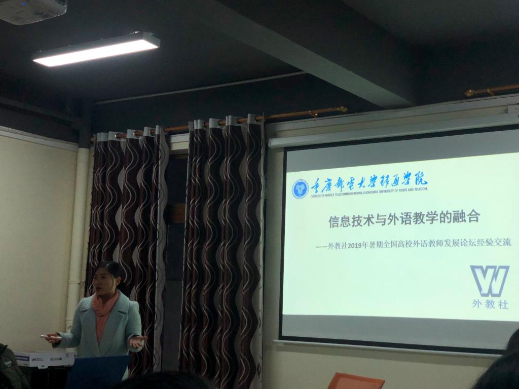 最后,刘菊老师对她在2019年暑假期间参加的全国高校外语教师发展论坛:“信息技术与外语教学的融合”进行了分享汇报。汇报内容主要涉及线上线下混合式“金课”建设理念与教学模式探讨;学术英语阅读的“智慧备课”;学术英语写作的“混合课堂”;在英语教学中融合技术的原则和途径;信息技术在教学设计中的运用--数据驱动教学决策和雨课堂技术。刘老师参与此次研讨会不仅带回先进的知识理论,分享了其他高校的智慧教学手段和前沿研究动态,还带回了教学可用的相关PPT、PDF、应用软件等材料。此外刘老师分享了暑假培训后,这学期自己在智慧教学中做出的努力和成效,提出作为新时代的大学教师应该充分利用智慧教学手段追求打造更优质的课堂。