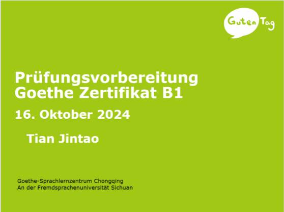 田进涛老师作为歌德学院的考试负责人,积累了十余年丰富的德语教学和歌德等级考试的考官经验,并且多次参加国内外关于德语教学法的培训学习,拥有扎实的德语教学理论基础。在讲座中,她详细介绍了歌德等级考试的相关内容,并强调了语言等级考试的目的是检验学生的真实语言能力。针对歌德B1考试的写作和口语部分,田老师详细讲解了考查点和评分准则,帮助老师们理解考试要求,更好地帮助同学们进行备考。