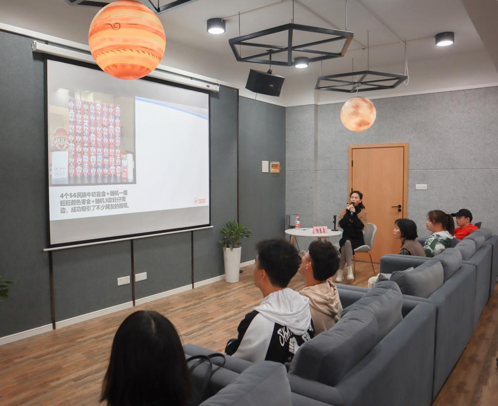 陶春霖老师分别从盲盒的发展经历、市场环境到品牌联名及其商业模式三个方面展开讲座。首先,陶老师给大家抛出了一个问题:什么是盲盒?台下同学有的窃窃私语,有的默默摇头,随后陶老师以“泡泡玛特”——一家潮玩公司的简短视频为大家生动的介绍了“盲盒”市场现状,由此引出其发展历程,从国外到国内,分别展示了“盲盒”在不同市场环境中的独特营销思路。在国外起初以福袋的形式出现在大众的视野中,以商品尾货处理为主要目的,而后逐渐商品化,随之推出线下“扭蛋机器”。在国内大多以品牌联名的方式吸引消费者眼球,例如旺仔牛奶盲盒系列——56个民族包装随机装箱。