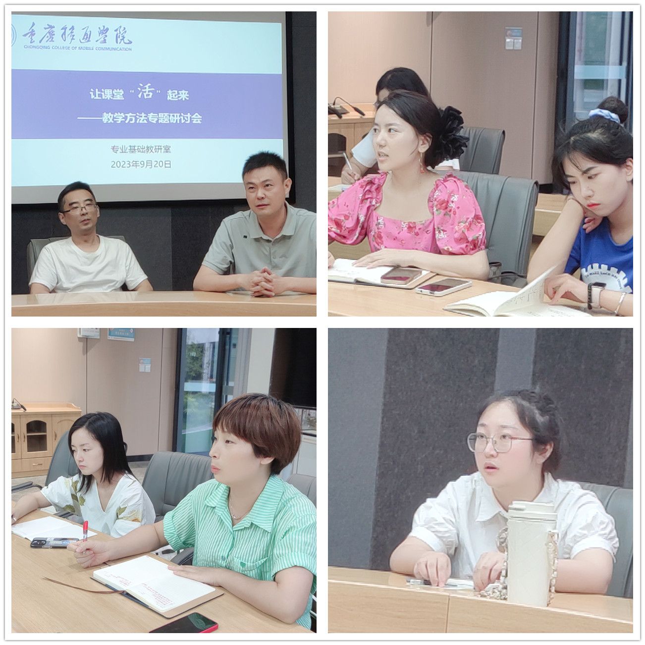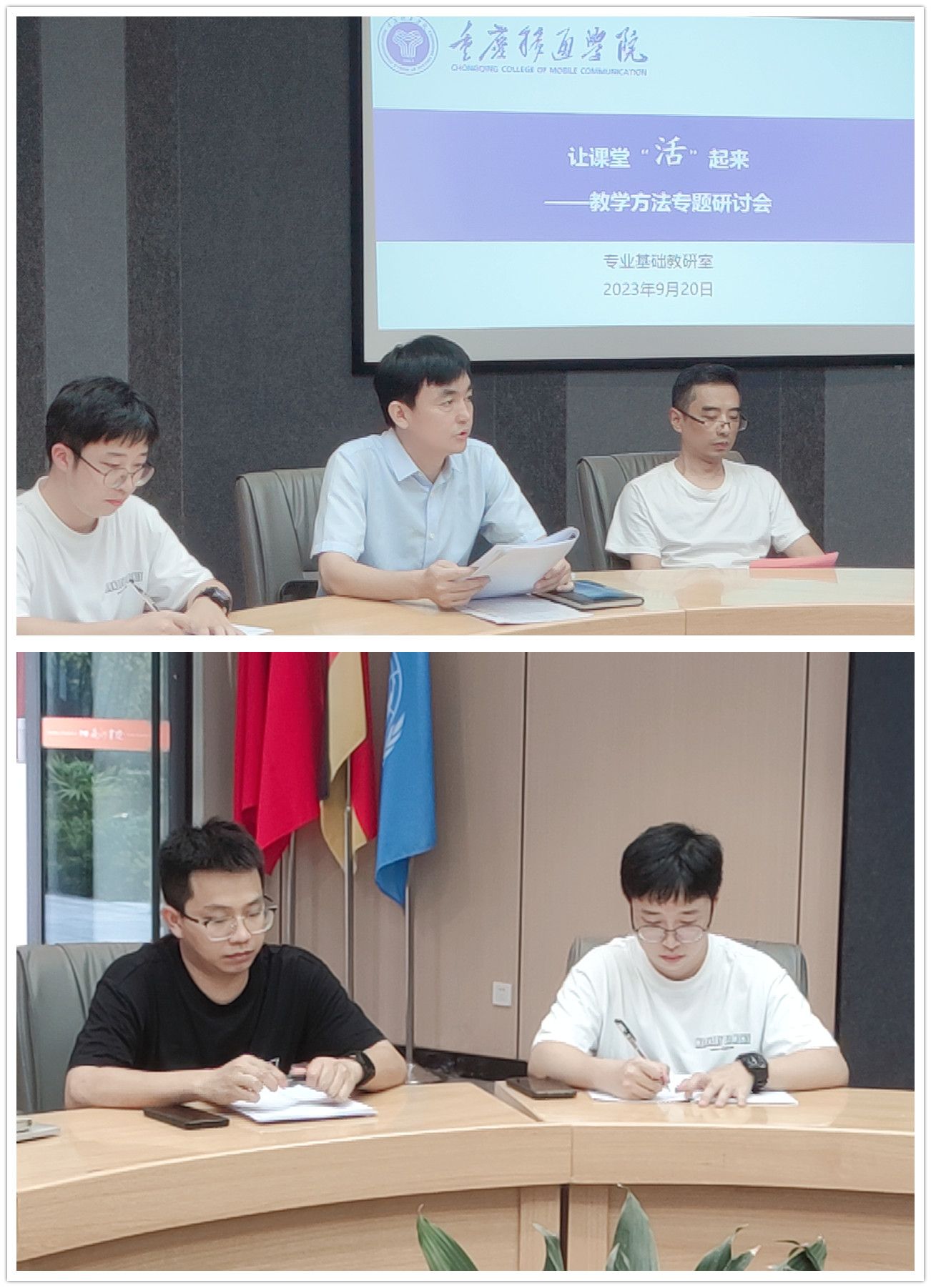 为积极推动教育教学创新与发展,全面落实《重庆移通学院“一流教学建设与改革”主题年活动方案》,9月20日下午,专业基础教研室在南湖书院圆桌会议室开展了“让课堂‘活’起来——教学方法专题研讨会”活动。本次活动由专业基础教研室主任席兵主持,教研室全体成员参加。