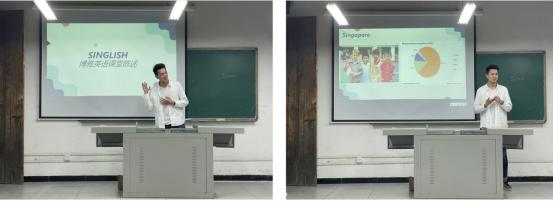 本次课程,程陈同学抽到的话题是“Singlish”,即新加坡式英语;受印度英语、马来语、汉语各方言等多个方面的影响,新加坡式英语不仅有“lah”“meh”这些后缀,在用词和发音上,也和英式美式英语有许多不同。程陈同学从用词、语法、发音三个板块进行了展示,口语表达地道流利,内容十分有趣。
