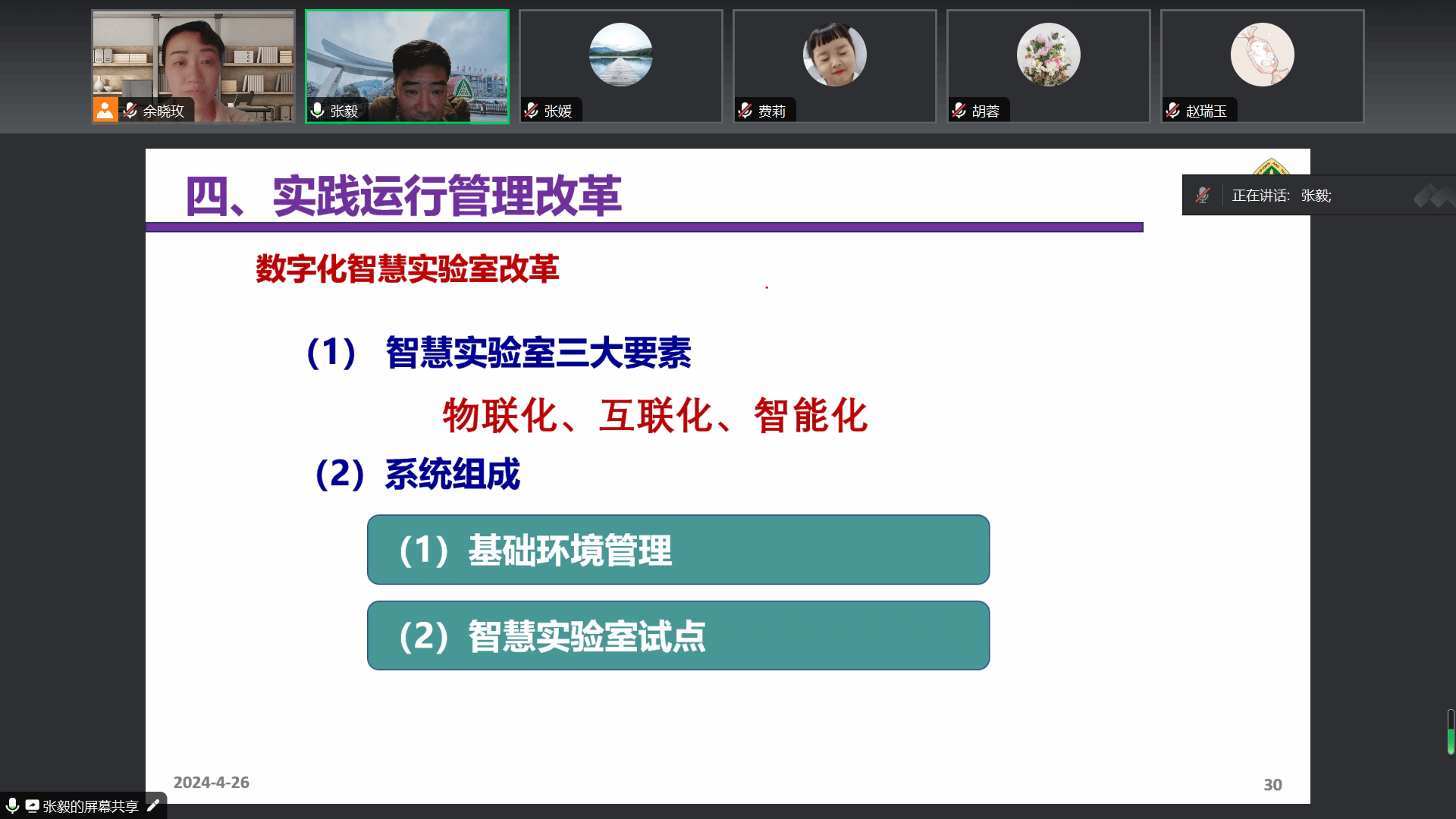 实践运行管理改革方面,张教授分享了数字化智慧实验室改革的经验及取得的成效,根据智慧实验室的物联化、互联化、智能化三大要素,重点介绍了基础环境管理和智慧实验室试点的设想。