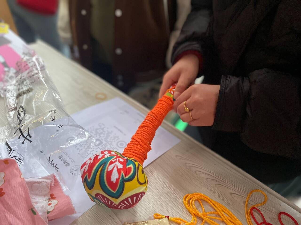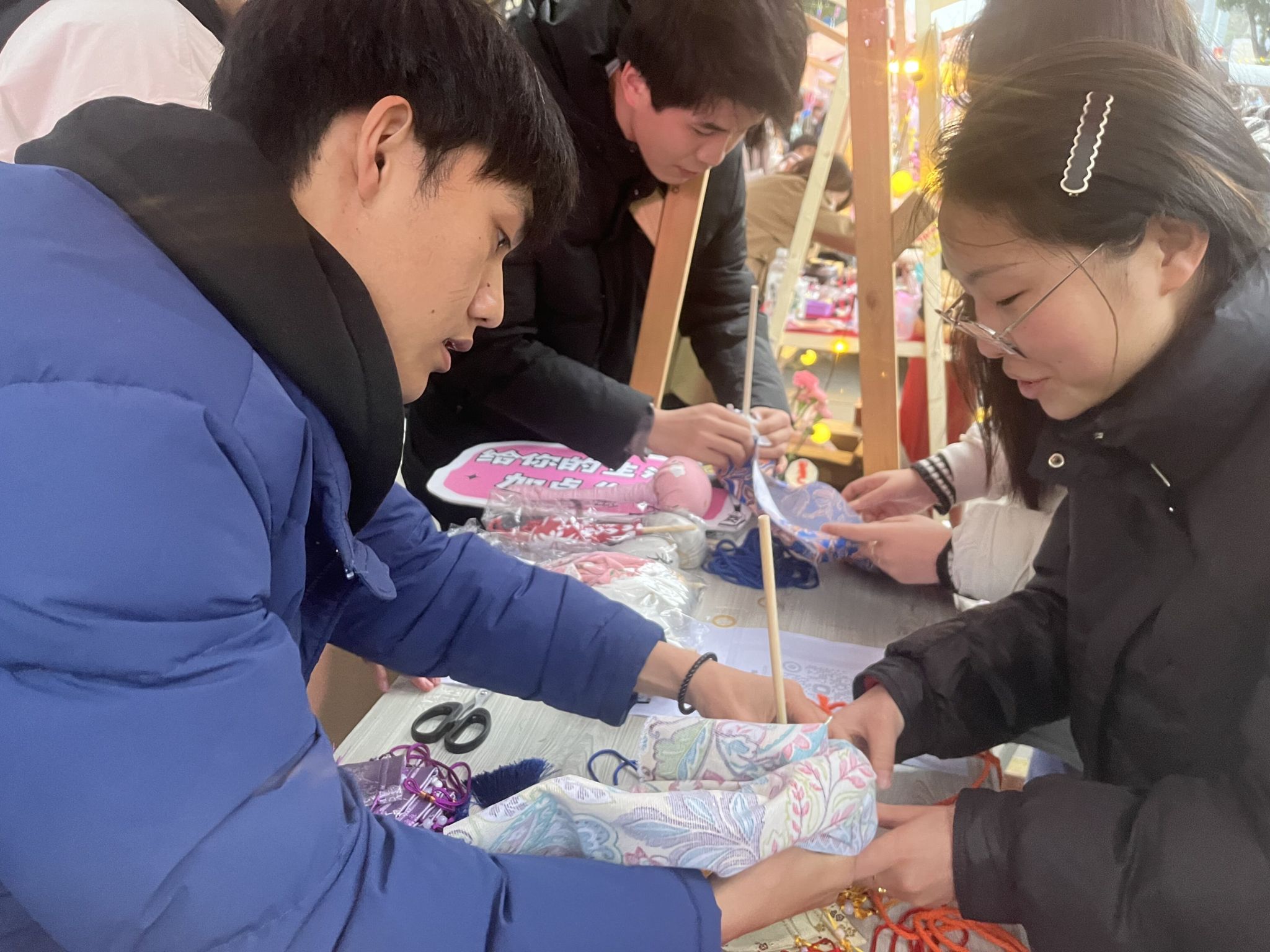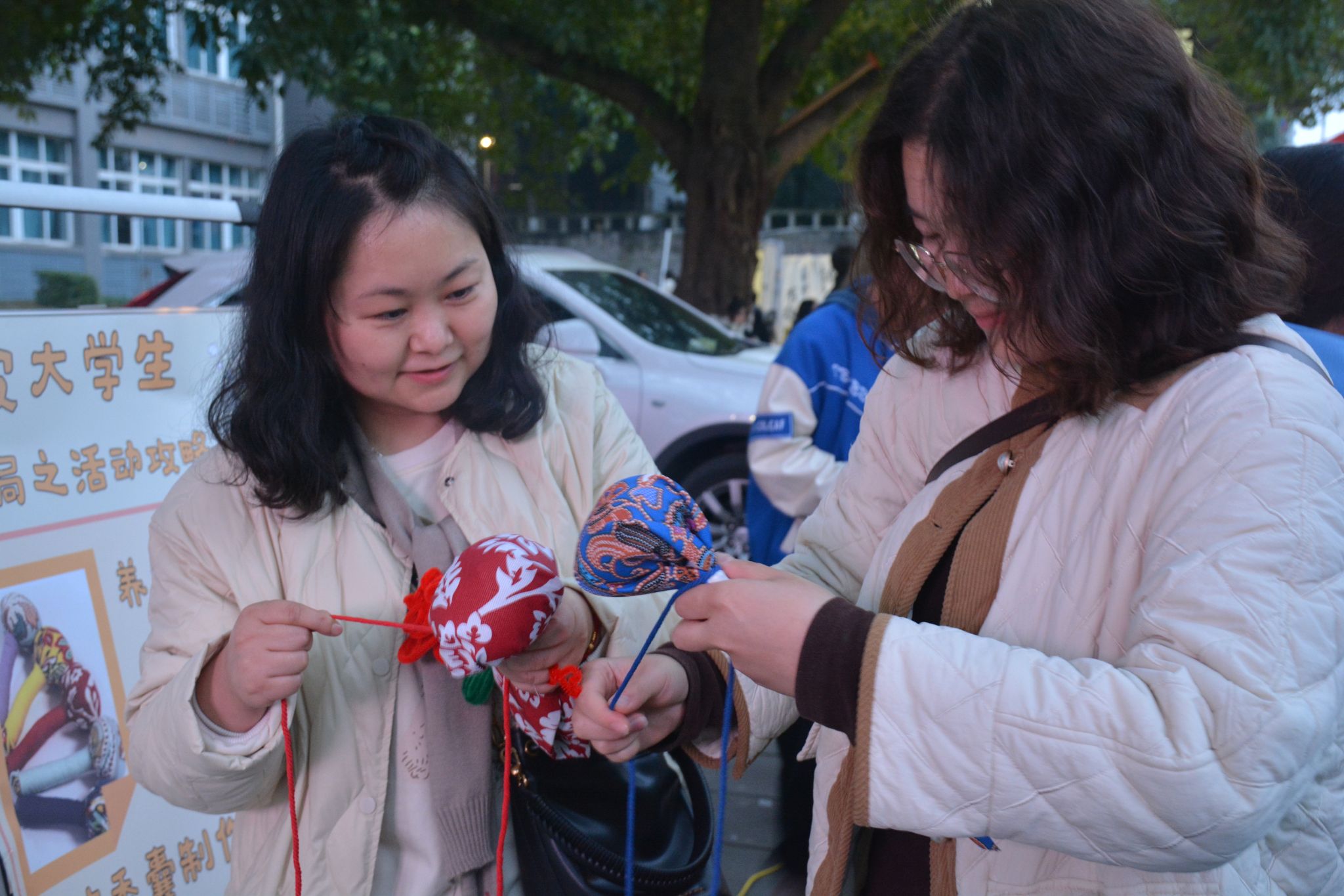 “彼采艾兮,一日不见如隔三岁兮。”《诗经·王风·采葛》体现了商周时期女子采摘艾草的习俗。艾草拥有三千多年的使用历史,从药用到食用,艾草锤则源自中医艾灸疗法,具有促进血液循环、舒缓肌肉疼痛、调节身体阴阳平衡等功效。如此优异的功效也让“脆皮大学生”们活动开始前的半小时排上了长长的队伍。同学们学习如何制作艾草锤,将艾草包裹在布料中,制成锤子形状,再用绳索缠绕握把。同学们亲自试用艾草锤,感受艾草的温热和舒缓效果,享受身心放松。一位参与体验的老师感叹道:“不愧是老祖宗传下来的东西,还是很有功效的!”