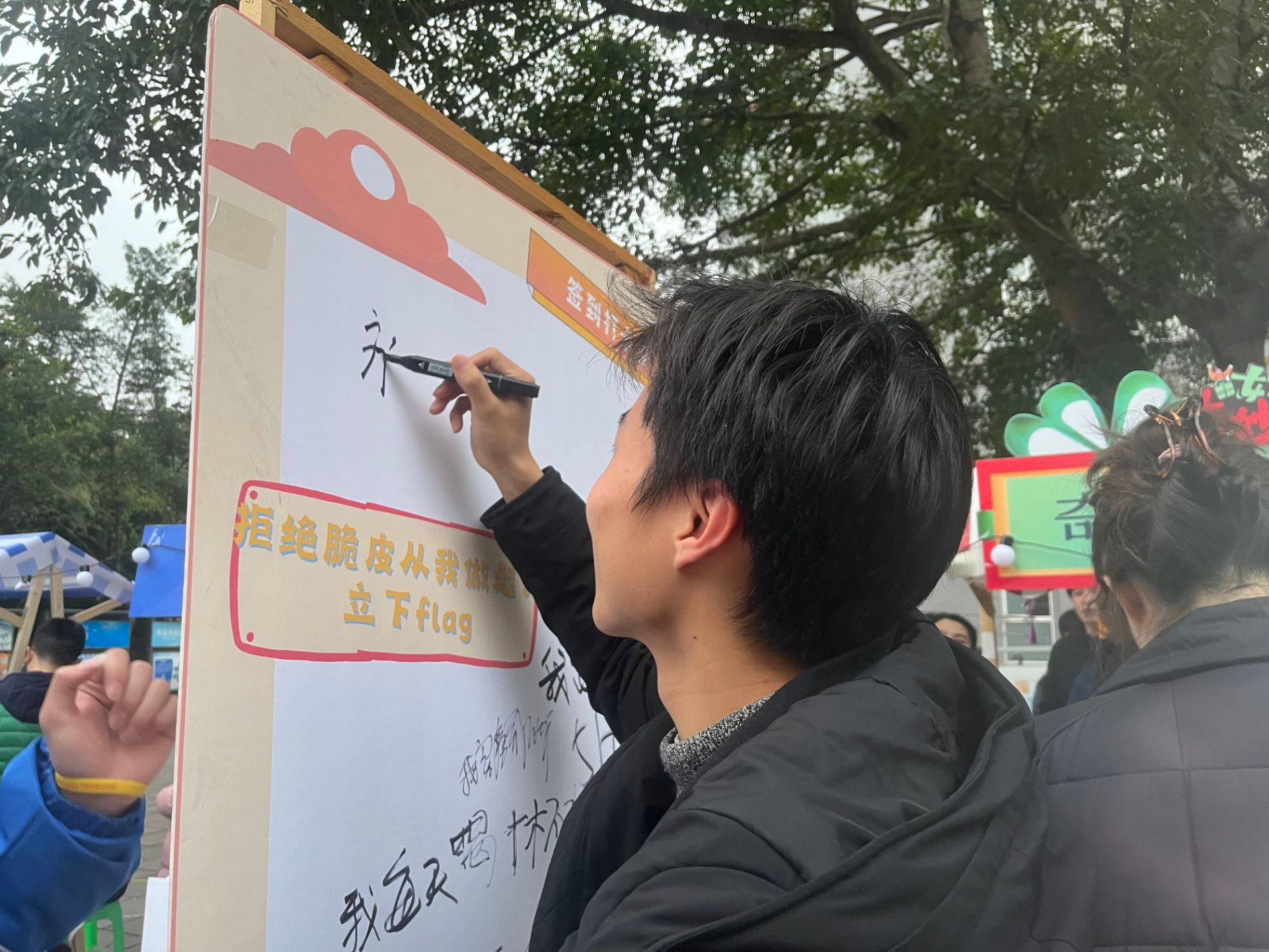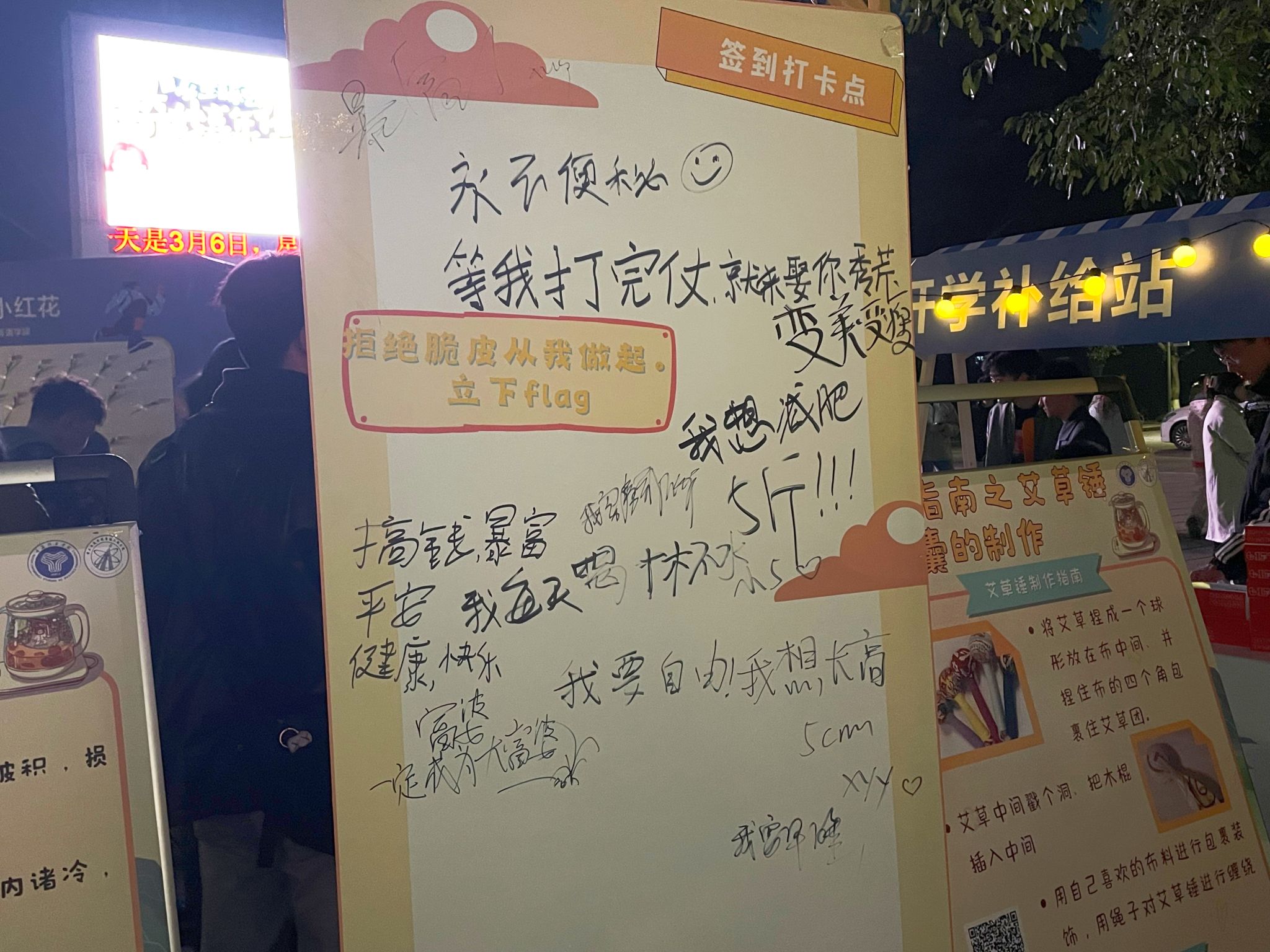 “移通有佳人,绝世而独立。”在活动现场的KT板上,女生们纷纷留下了“我要自由”“我要长高”等美好祝愿,还有女生们立下健康flag,男生们送出的祝福等,让这个女生节更加难忘。旁边的养生小贴士上使同学们获益良多,如八段锦使用指南与口诀、各种药材功效等。伴随着清香和热烈的氛围,同学们不仅享受了这个充满乐趣的养生体验,还获得了养生小知识。